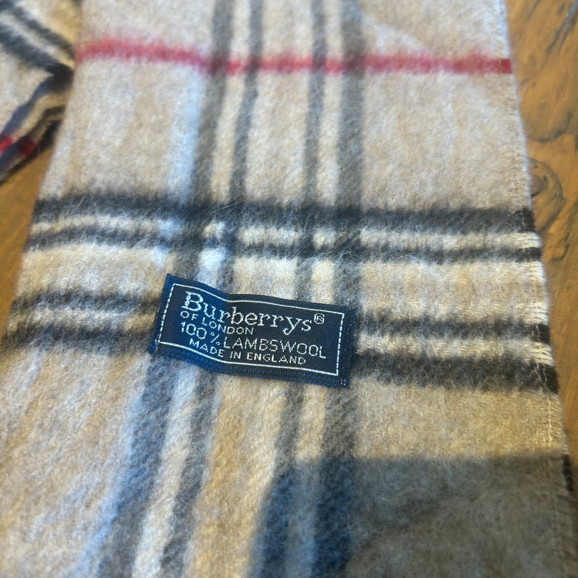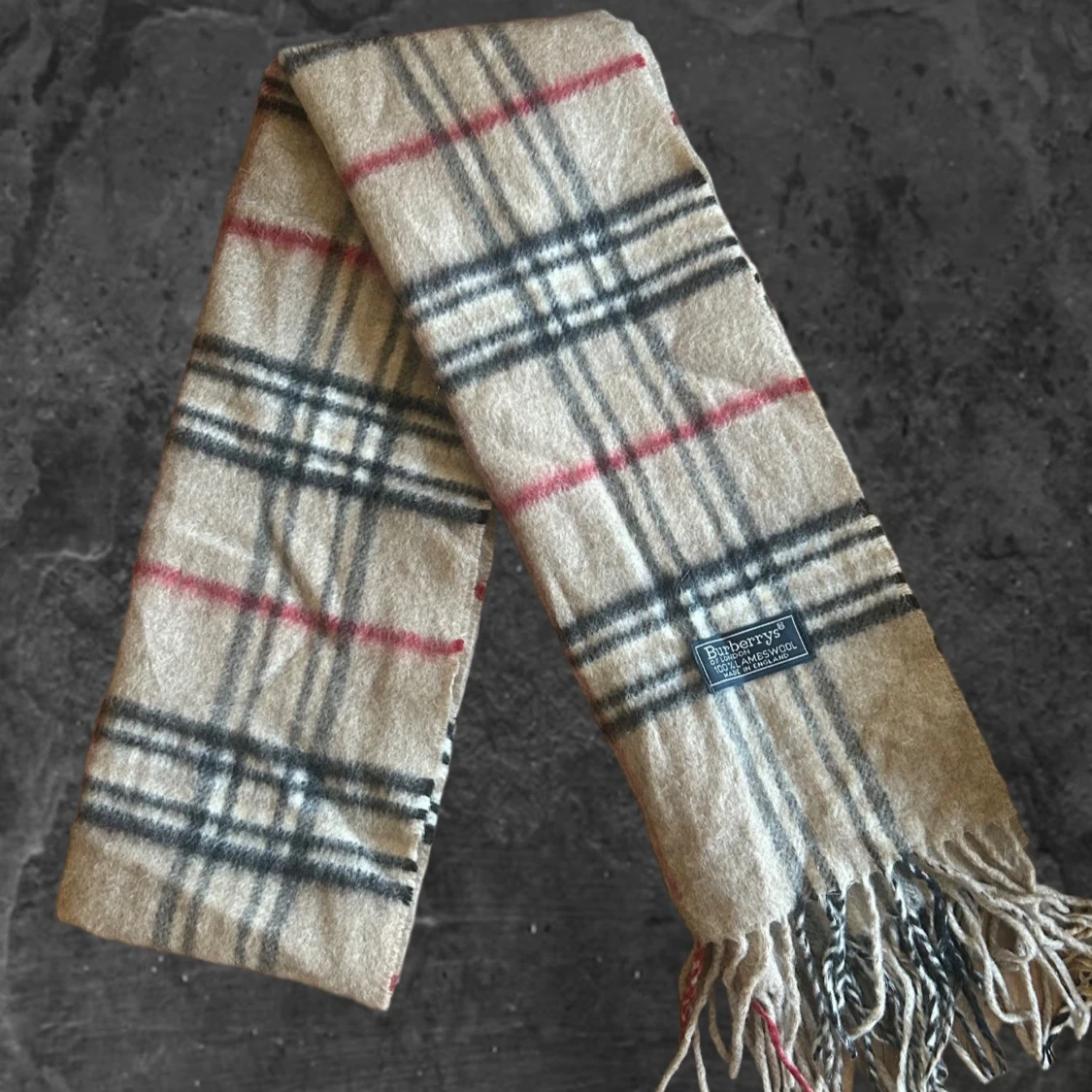 Klassisk rutig halsduk från Burberrys i beige, svart, rött och vitt. Tillverkad i 100% lammull och har fransar i ändarna. Den ikoniska rutiga designen gör den till ett riktigt statement-plagg för vintern.
