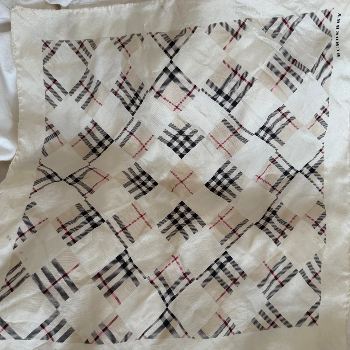 Snygg och klassisk halsduk från Burberry i siden med det ikoniska rutiga mönstret i svart, rött och beige på vit botten. Perfekt storlek för att ha runt halsen eller som accessoar. Diskret Burberry-logga i hörnet.