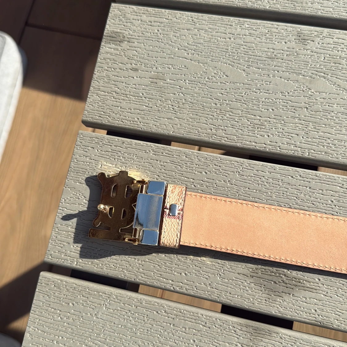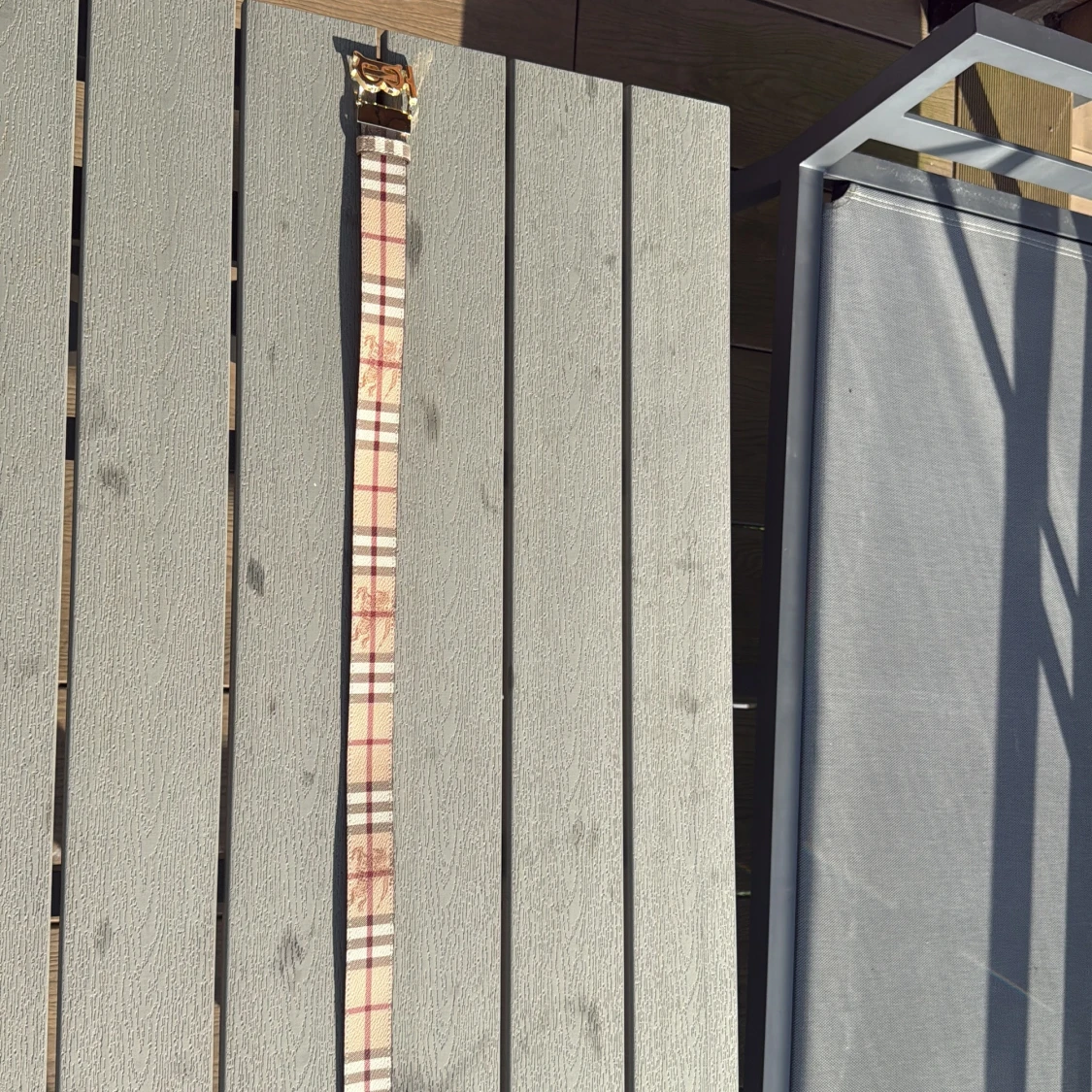 Snyggt Burberry-bälte i klassiskt rutigt mönster med beige, bruna, vita och röda toner. Skärpet har ett exklusivt guldigt spänne med Burberrys ikoniska monogram. Tillverkat i skinn med lyxig känsla och detaljerad finish.