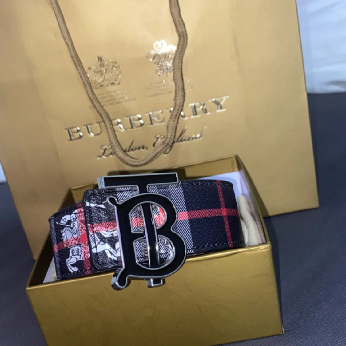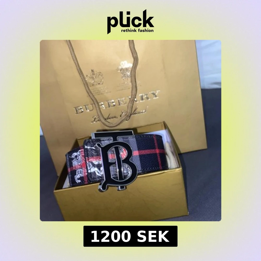 Säljer ett Burberry bälte i svart skinn med klassiskt rutig design i svart, rött och vitt. Bältet har en stor metallspänne med Burberrys B-logga och präglad Burberry-ryttare på insidan. Kommer med originalbox, dustbag och certifikat.