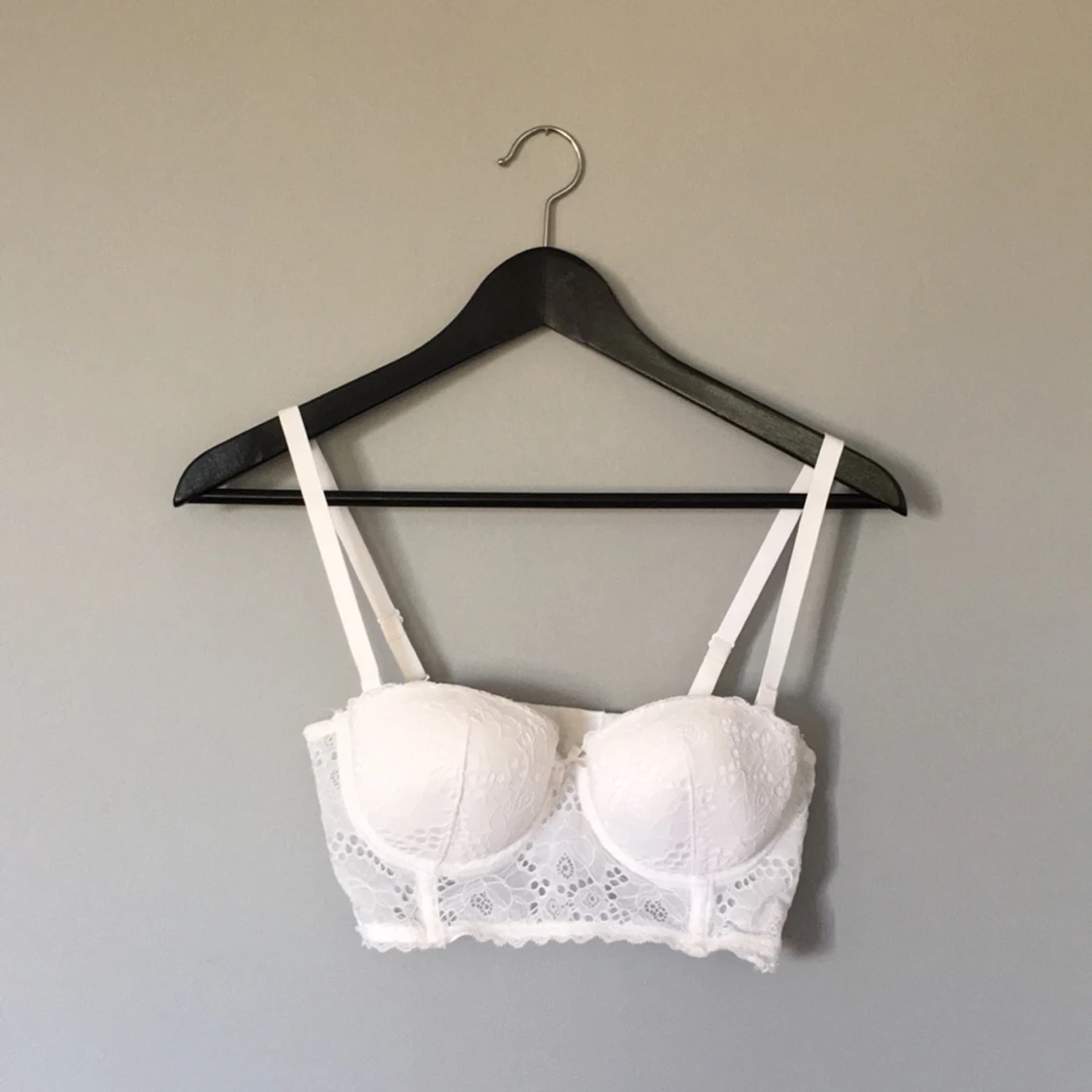 Vit bustier med avtagbara axelband i fin spets. Silikon-linje på insidan av bh-n som går omkretsen runt för att förhindra att den åker ner när du inte har axelbanden. Bh-n är i nyskick och har fem hakar på baksidan av bh-n. Först till kvarn!