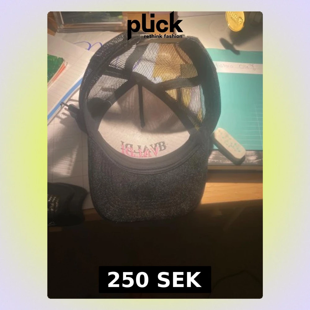 Snygg truckerkeps från BVALDI med svart glittrig skärm och vit frontpanel ny pris 499. Kepsen har broderad logga i svart och rosa, samt mesh på sidorna och bak för extra ventilation. Perfekt för att lyfta din streetstyle-look och bli mer populär