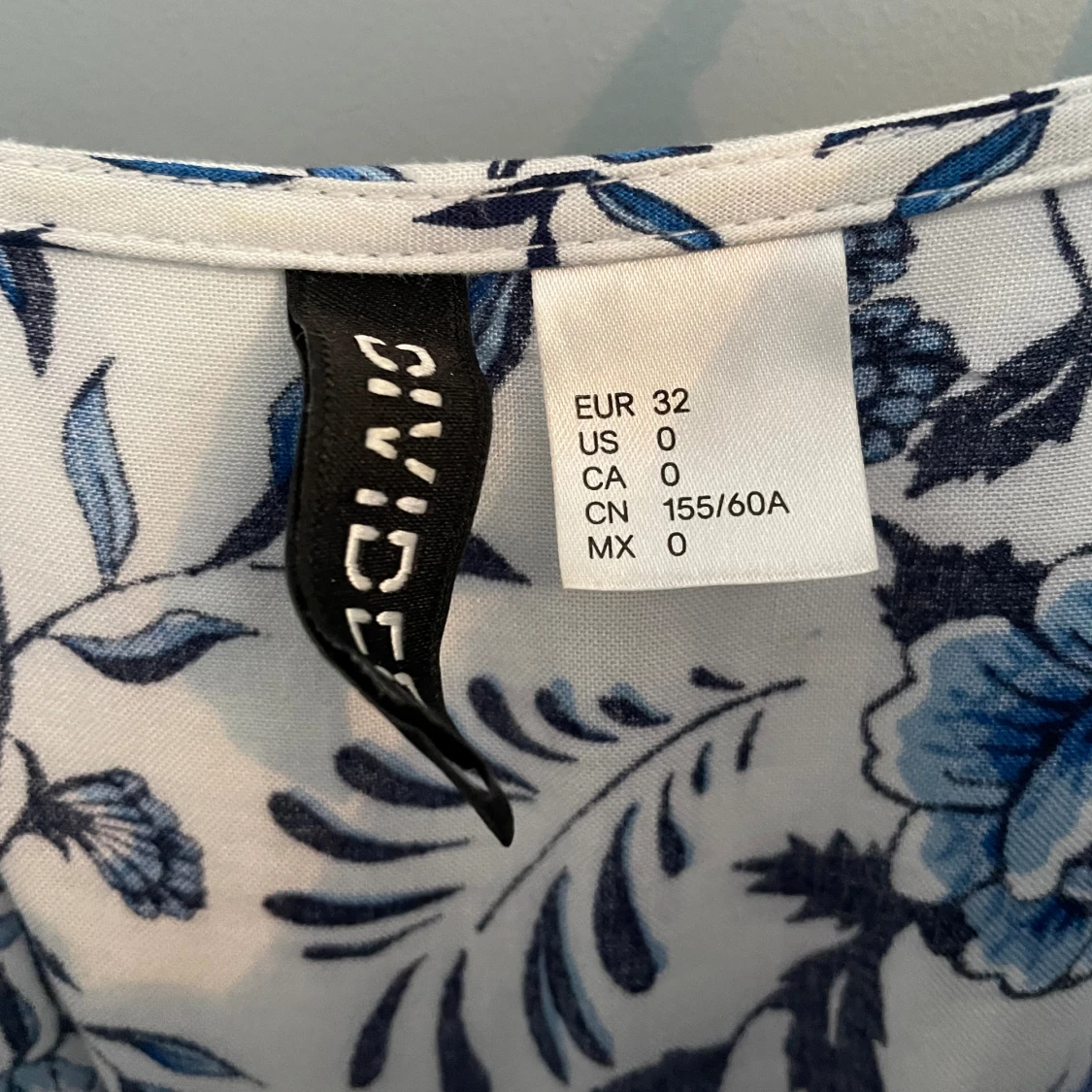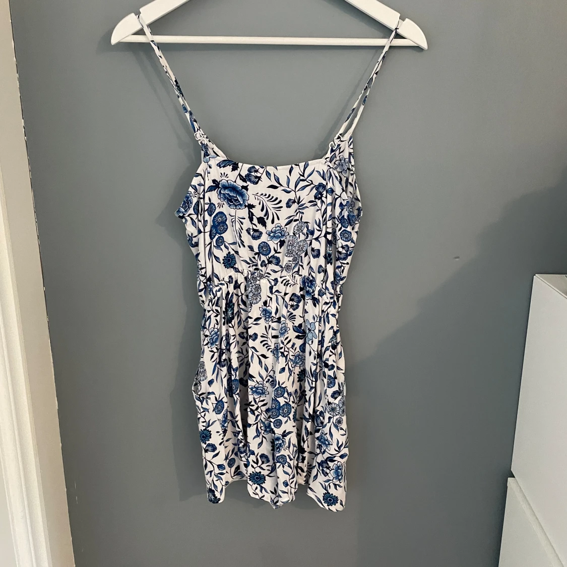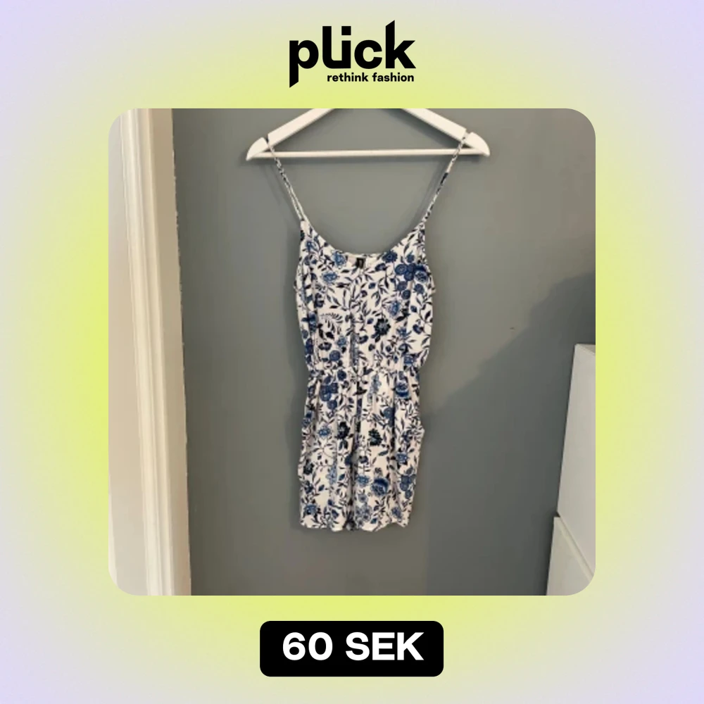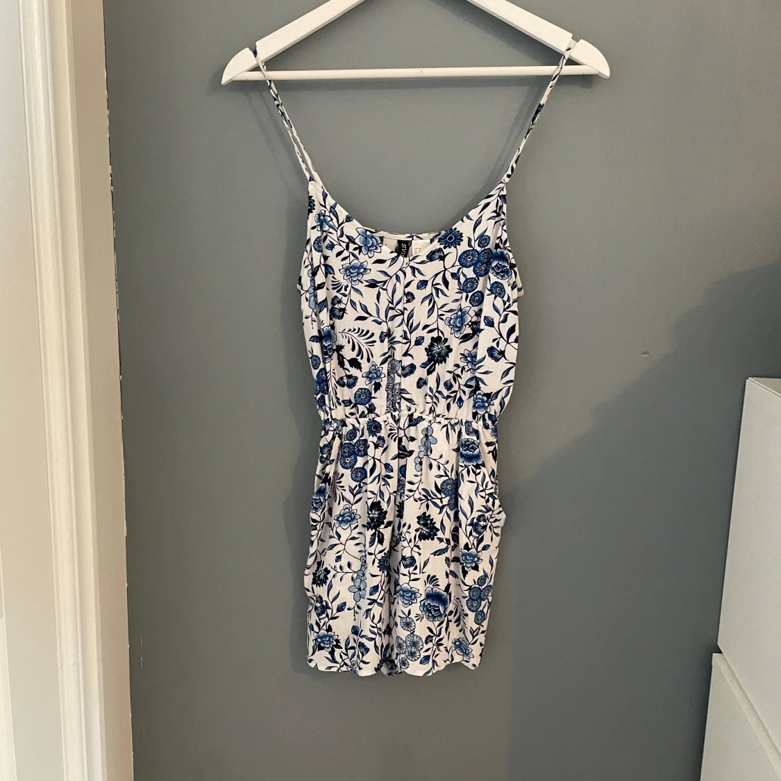 Jätte gullig blå/vit blommig byxdress, strl 32, ganska kort, justerbara band, anvpnd 1-2 gånger, har fickor✨