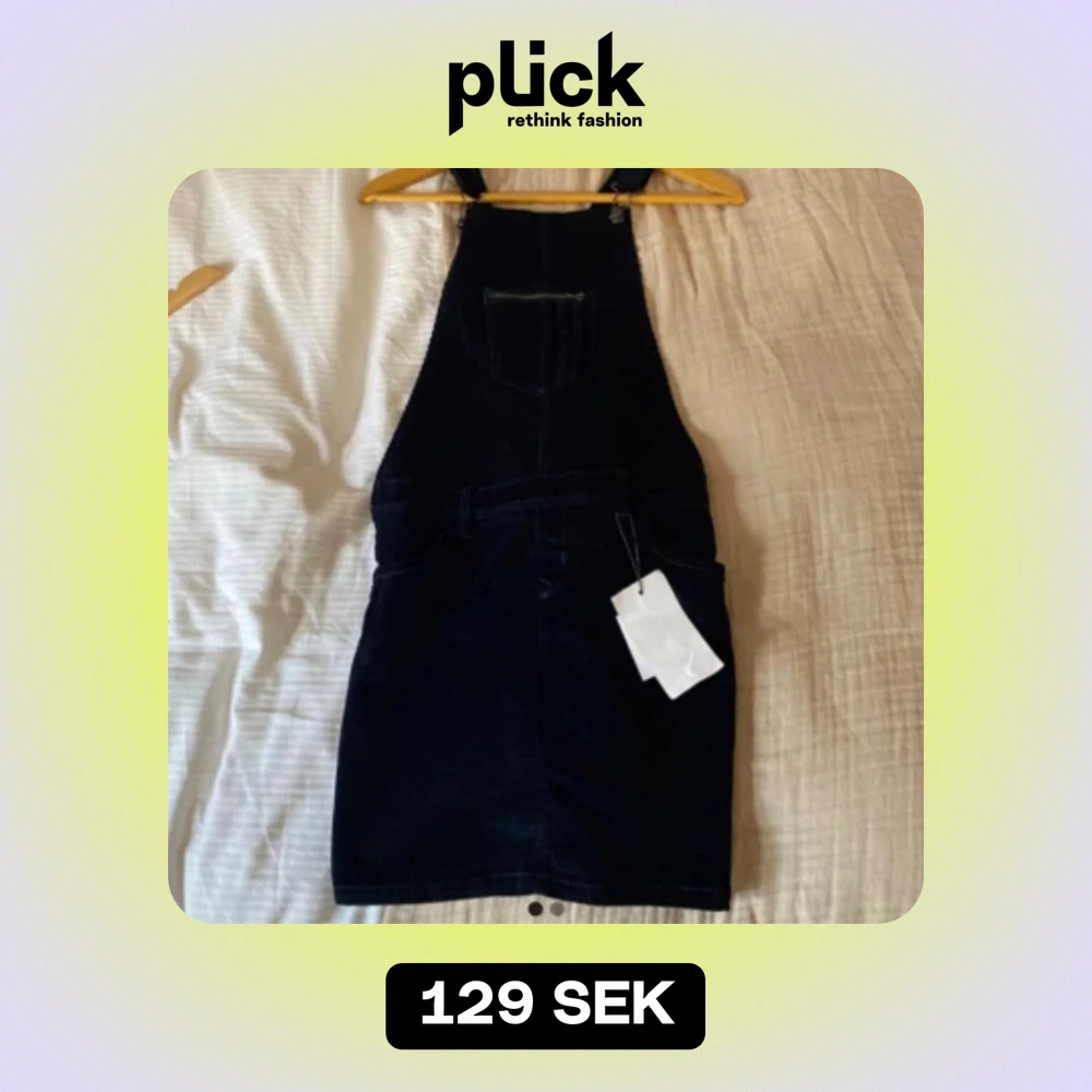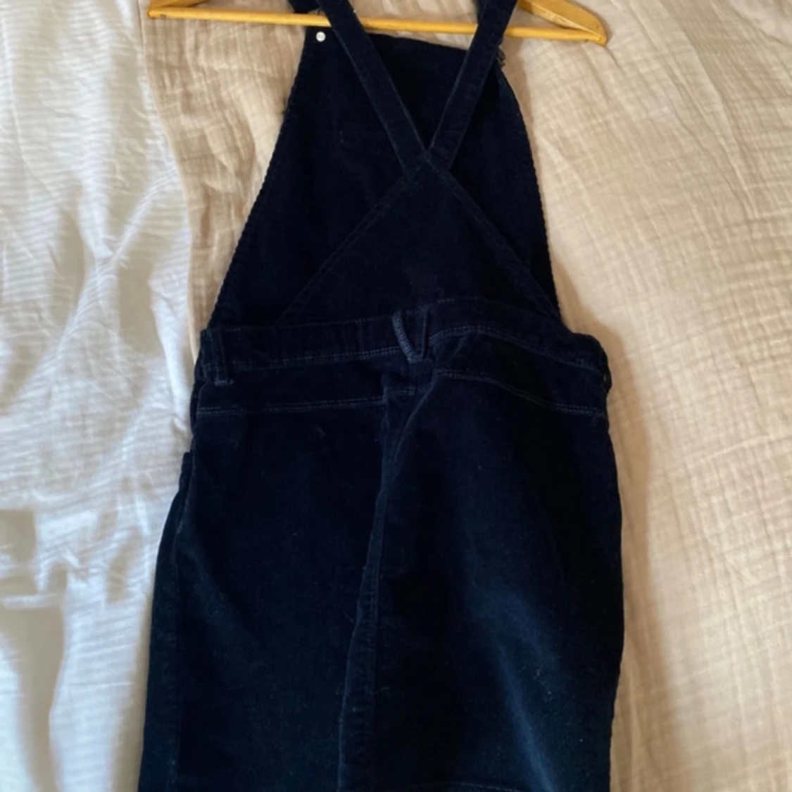 Mörkblå hängseldress i manchestertyg fast som är som en kjol nertill även kallad ”bibskirt” i barnstorlek.