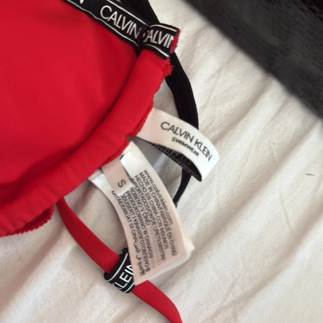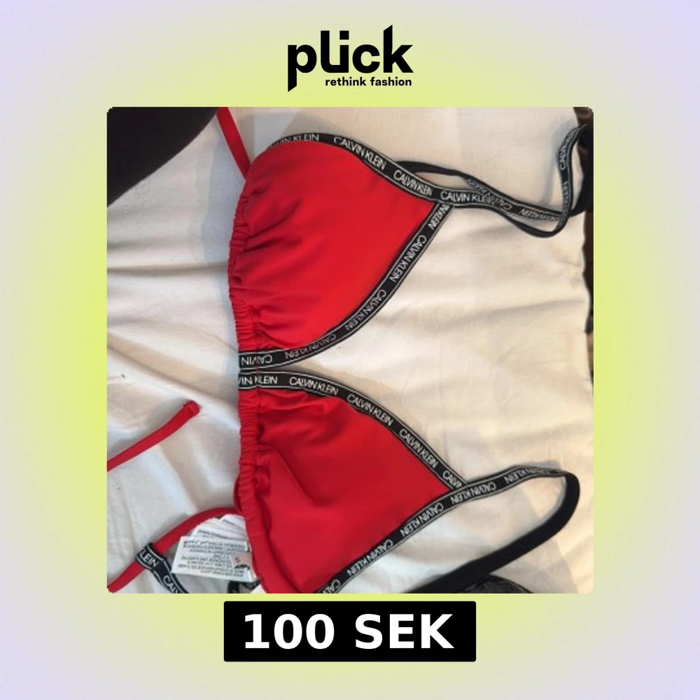 Snygg röd bikini från Calvin Klein med svarta och vita logoband runt kanterna. Klassisk trekantsmodell med knyt i nacken och ryggen. Perfekt för stranden och sommarens alla poolhäng. Ny skick