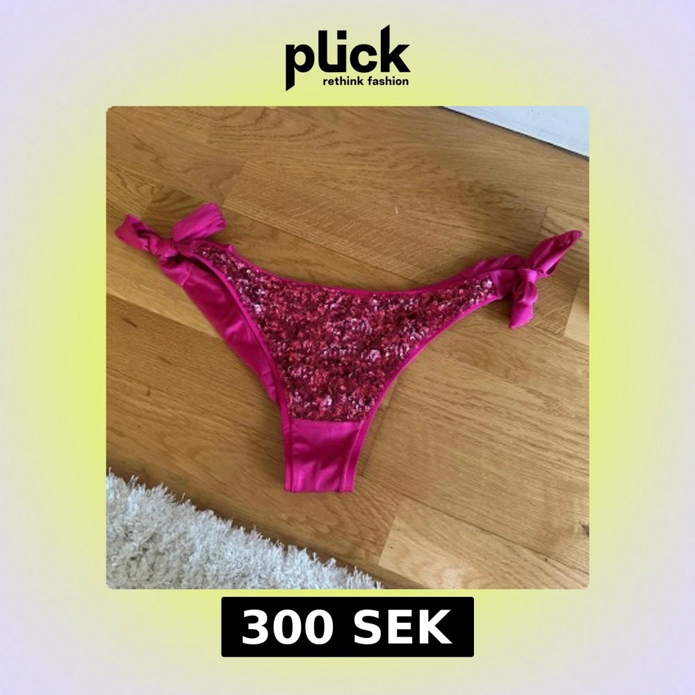 Snygg bikiniunderdel i stark rosa färg från Calzedonia. Nyköpt med lapparna kvar, men tyvärr tog jag av den före jag testade…🙈och de passade tyvärr inte. Framsidan är täckt av glittriga paljetter och sidorna har knytband för en justerbar passform. Materialet är glansigt och känns lyxigt, perfekt för strandhäng eller poolparty. Köpt för ungefär 450 kr och säljer för 300 då den är helt ny och aldrig använd, endast testad, skriv privat för fler frågor💗
