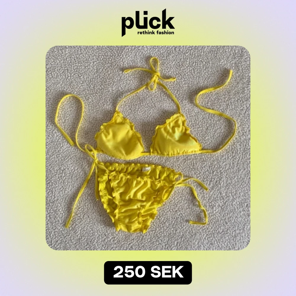 Supersnygg gul glittrig bikini från Calzedonia. Använd enstaka gång. Storlek 75B i överdel och S i trosor. I mycket bra skick. Samma modell som på sista bilden fast gulglittrig.