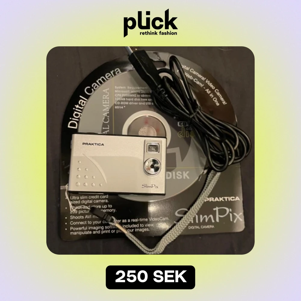 Praktica SlimPix digitalkamera. Kameran är liten och kompakt, perfekt för att ta med sig på resan. Den har en inbyggd blixt och kan ta bilder i hög upplösning. Kameran levereras med en USB-kabel laddare batteri i och en CD-skiva med programvara.