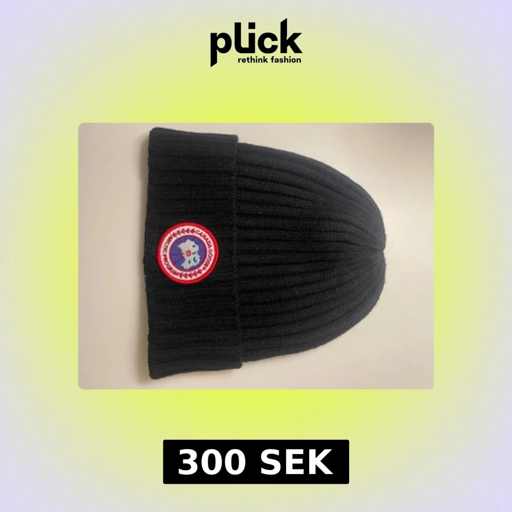 Säljer en svart ribbstickad mössa från Canada Goose med klassisk rund logotyp framtill. Mössan har bred uppvikt kant och är tillverkad i mjukt stickat material som håller dig varm under kalla dagar.