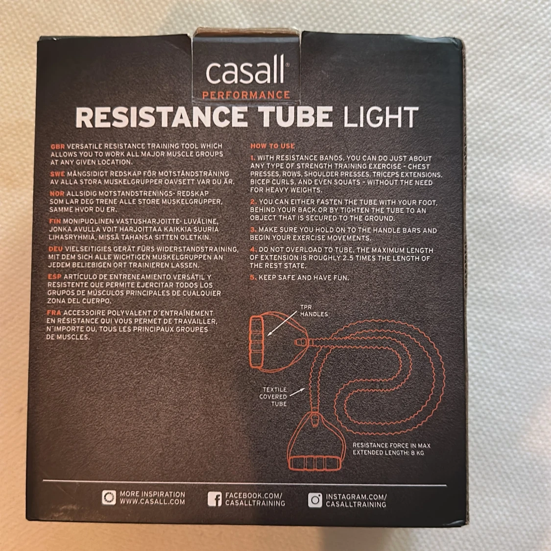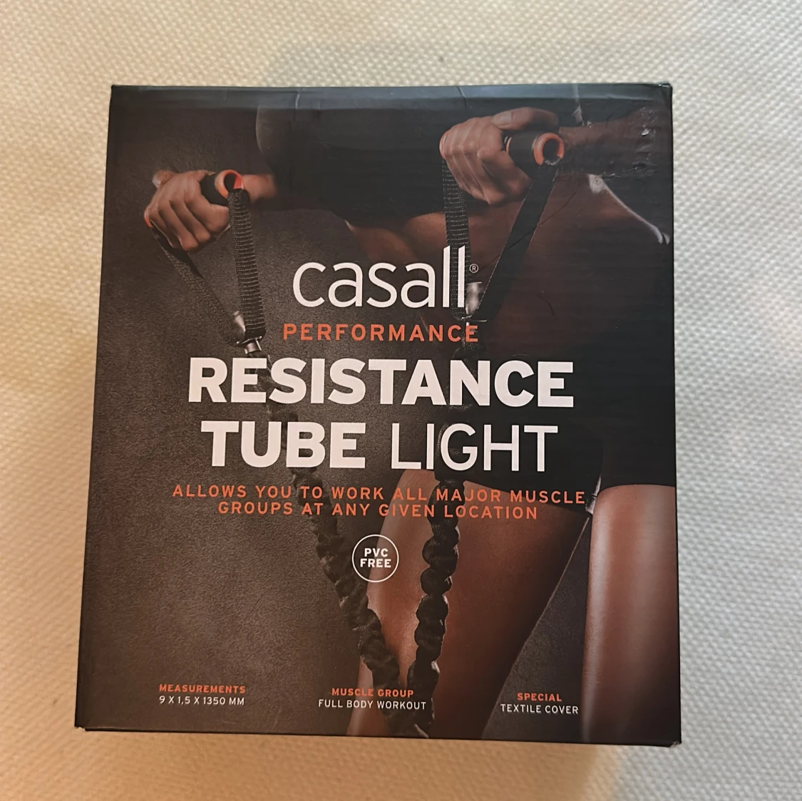 Casall Resistance Tube Light är ett mångsidigt träningsredskap för motståndsträning av hela kroppen. Med textilöverdrag och TPR-handtag, passar den för alla större muskelgrupper. Produkten är PVC-fri och i nyskick, perfekt för styrketräning hemma eller på resan.