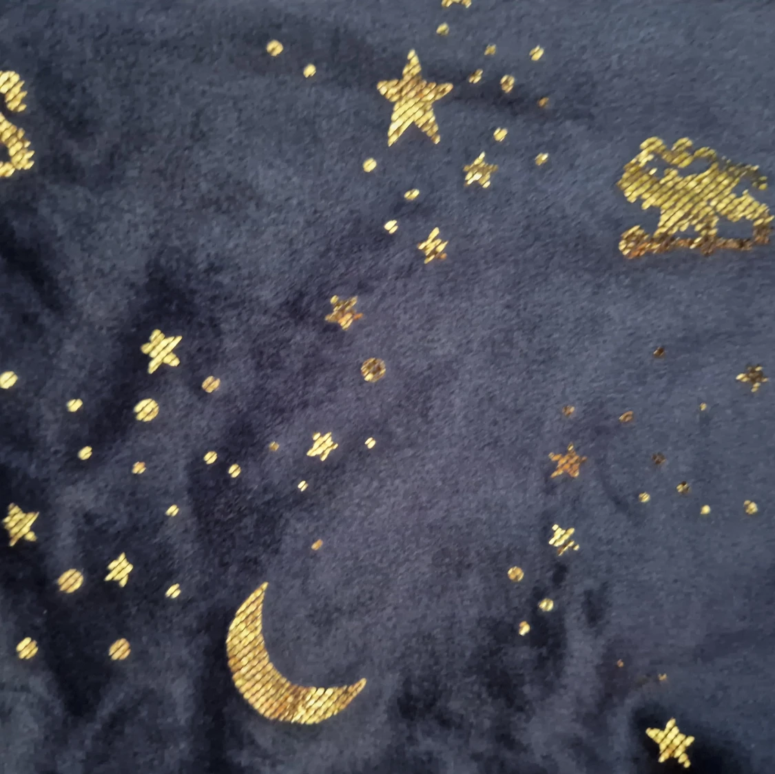 Mörkblå pyjamasbyxor & tröja från Chelsea FC med guldiga stjärnor, månar och klubbens lejonlogga. Byxorna & tröjan är i mjuk polyester och byxorna har resår i midjan för extra komfort. Perfekta för chillkvällar eller när du vill visa ditt lagstöd hemma.