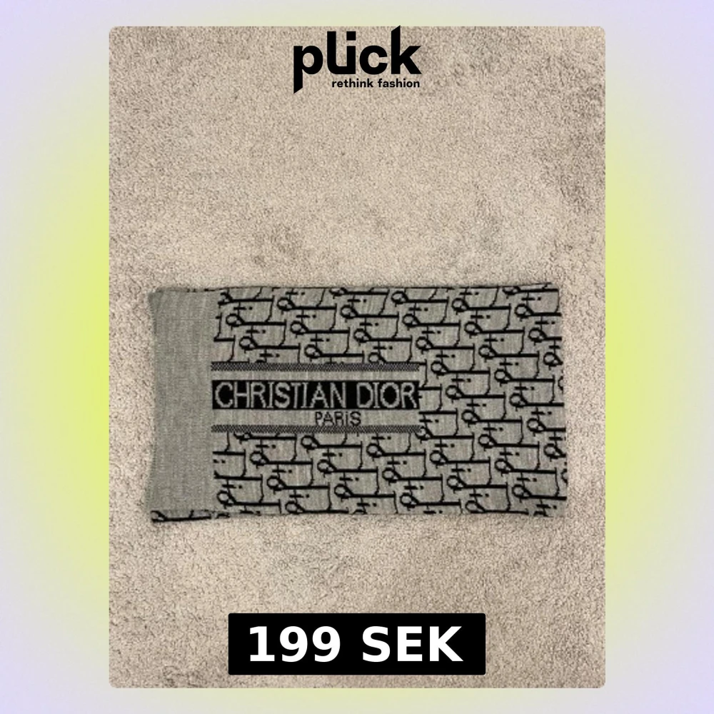 Snygg stickad halsduk från Christian Dior Paris med grå och svart färg. Halsduken har ett grafiskt mönster med Dior-loggor över hela och en bred logotyp framtill. Materialet är mjukt och stickat, perfekt för att ge din outfit en lyxig touch.