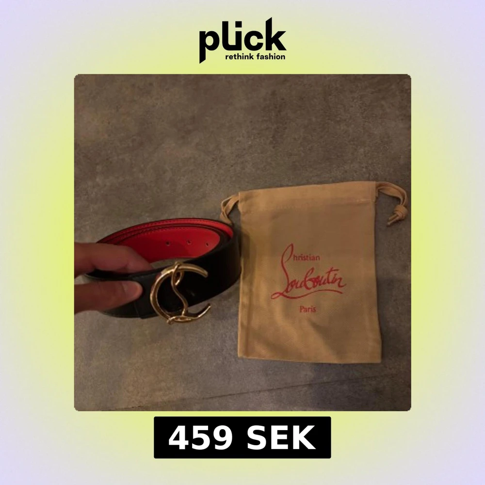 Säljer ett svart bälte från Christian Louboutin med röd insida och ett stort, guldfärgat spänne i form av CL-loggan. Bältet är tillverkat i skinn och har en exklusiv känsla med tydliga detaljer.
