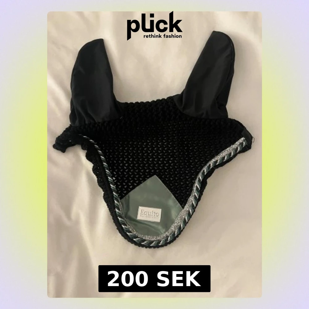 Snygg svart huva till häst från Equito med virkade detaljer och öron i slätt tyg. Kantad med flätad silver- och grön dekor. Märkeslapp framtill. Perfekt för att skydda hästens öron mot insekter och ljud.