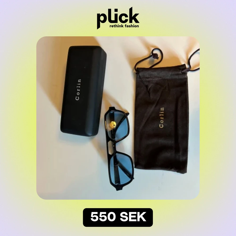 Corlin eyewear SAM solglasögon, blått glas med svart båge. Nypris 1299kr på deras hemsida. Allt original medföljer, fodral och ”påsen” till glasögonen.