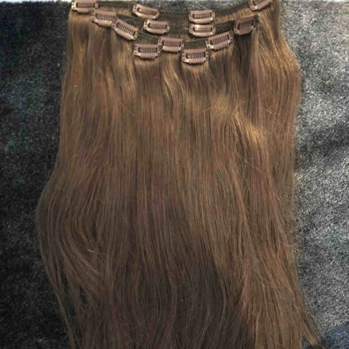 60cm long real human hair extensions. Almost like new. I paid 1200kr. Selling for 700kr. The color is light brown.
