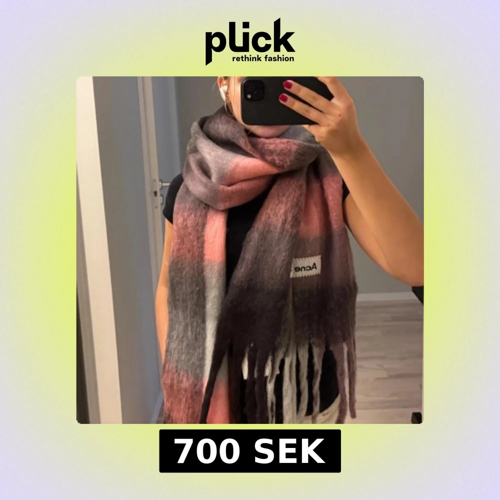 Stor och fluffig halsduk från Acne Studios med rutigt mönster i rosa, grått och svart. Långa fransar i ändarna och mjuk känsla, perfekt att vira flera varv runt halsen. Snygg logotyp-patch på ena sidan. Grym accessoar för kalla dagar.