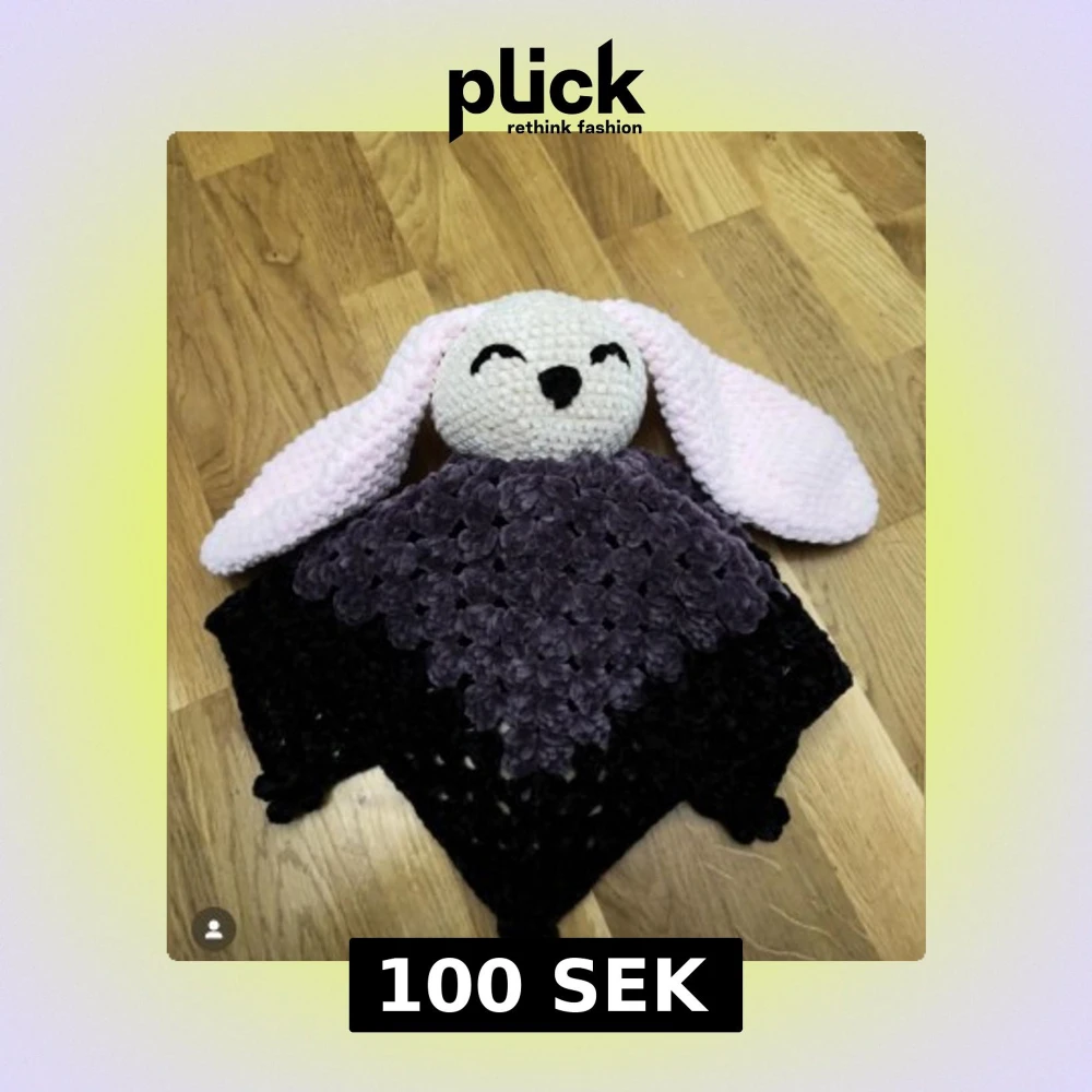 Bilderna visar en handgjord virkad snuttefilt med ett gulligt kaninhuvud och långa rosa öron. Filten är mjuk och har en lila och svart färgskala, perfekt som present till någon som gillar hantverk eller vill ha en mysig accessoar. Passar dig som gillar unika, kreativa och personliga saker.