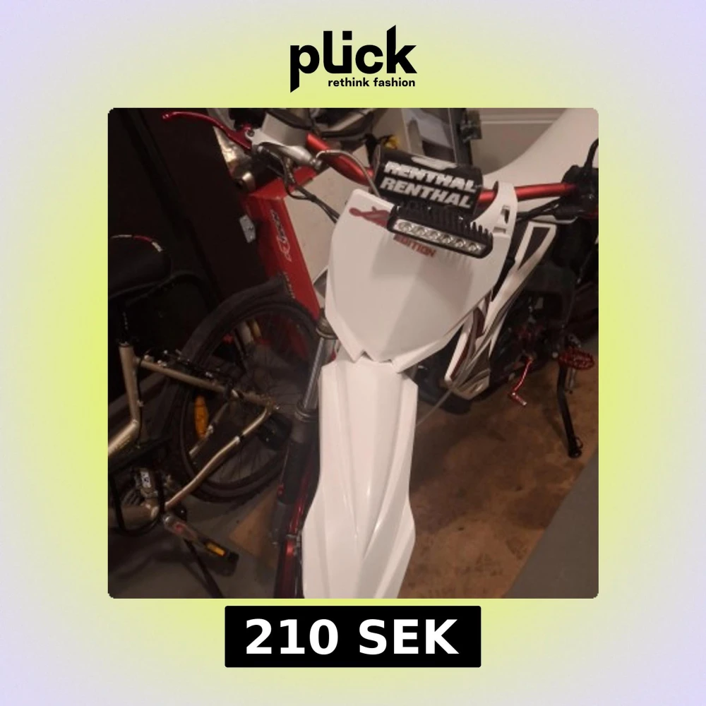 Bilden visar en motorcykel eller crosscykel med Renthal styre och LED-ljus, men ingen elektronikprodukt från den angivna taxonomin kan identifieras.