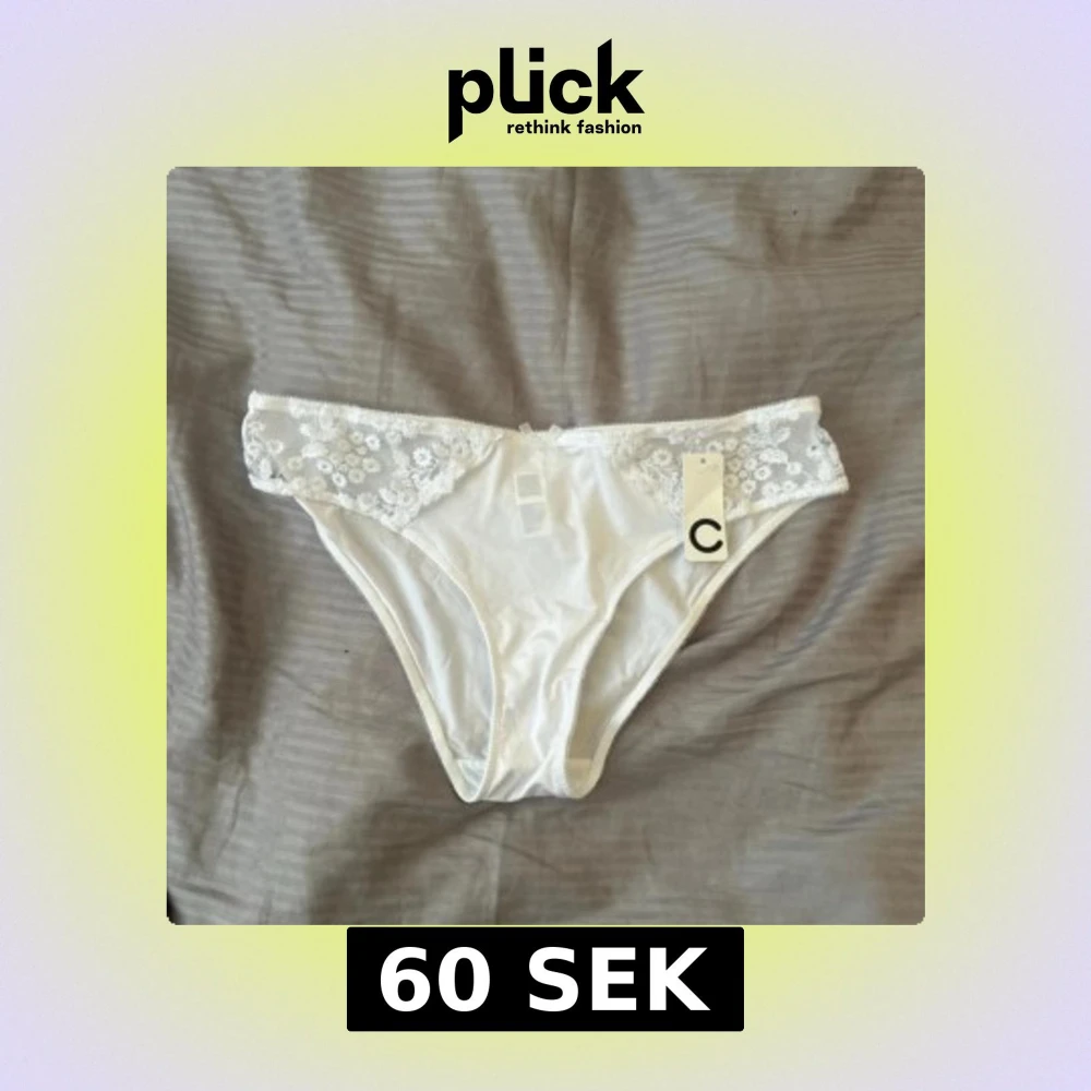 Snygg vit trosa med blommiga spetsdetaljer på sidorna och mjukt tyg framtill och baktill. Spetsen har små broderade blommor.helt oanvända med prislapp kvar, I storlek L/40. Köpta för 149kr säljer för 60kr .