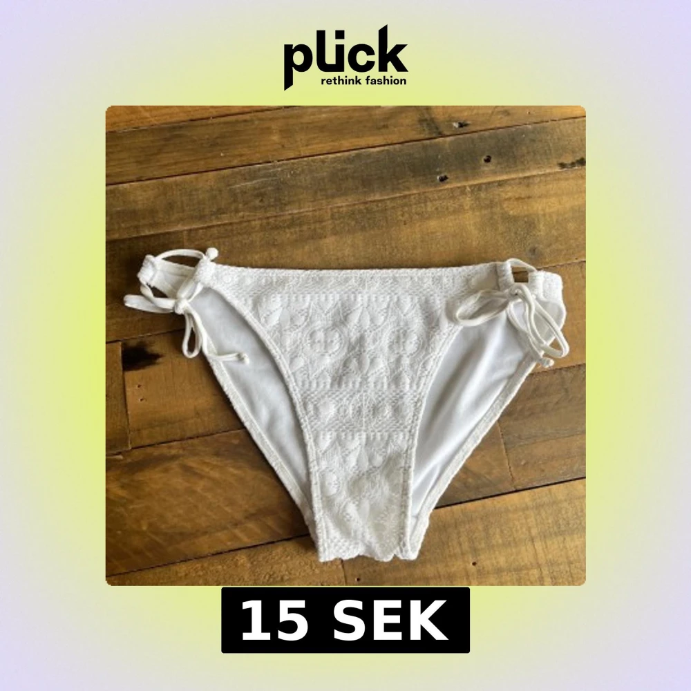 Supersnygg vit bikiniunderdel med virkade detaljer och knyt i sidorna.