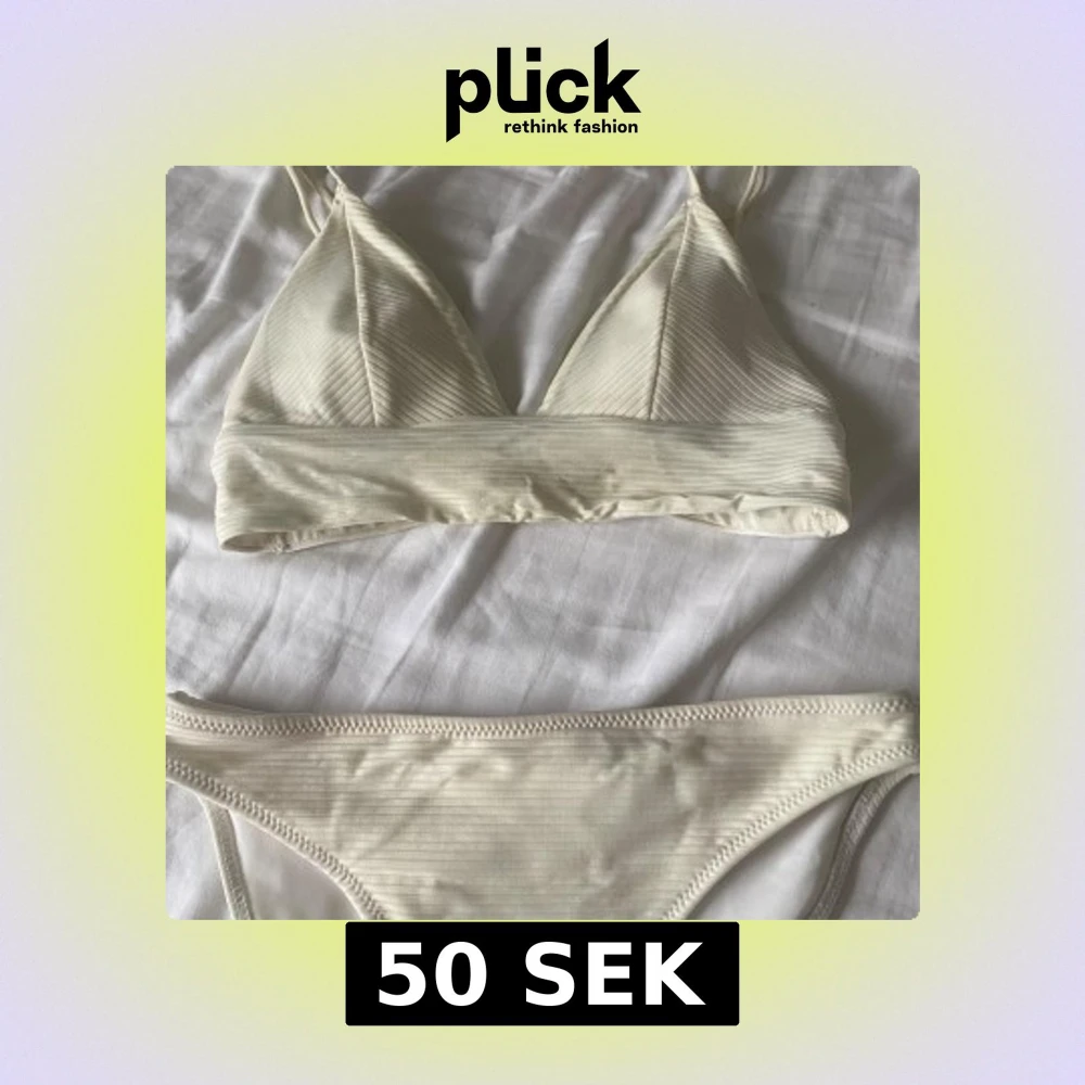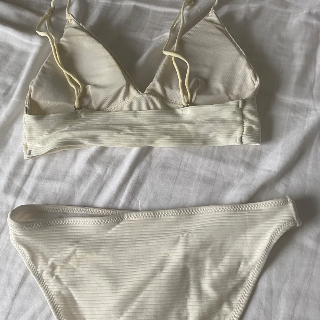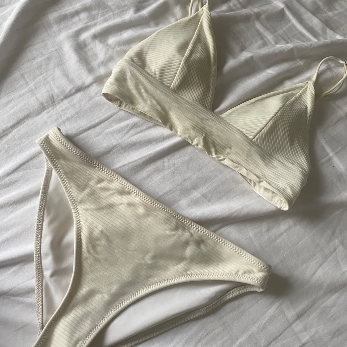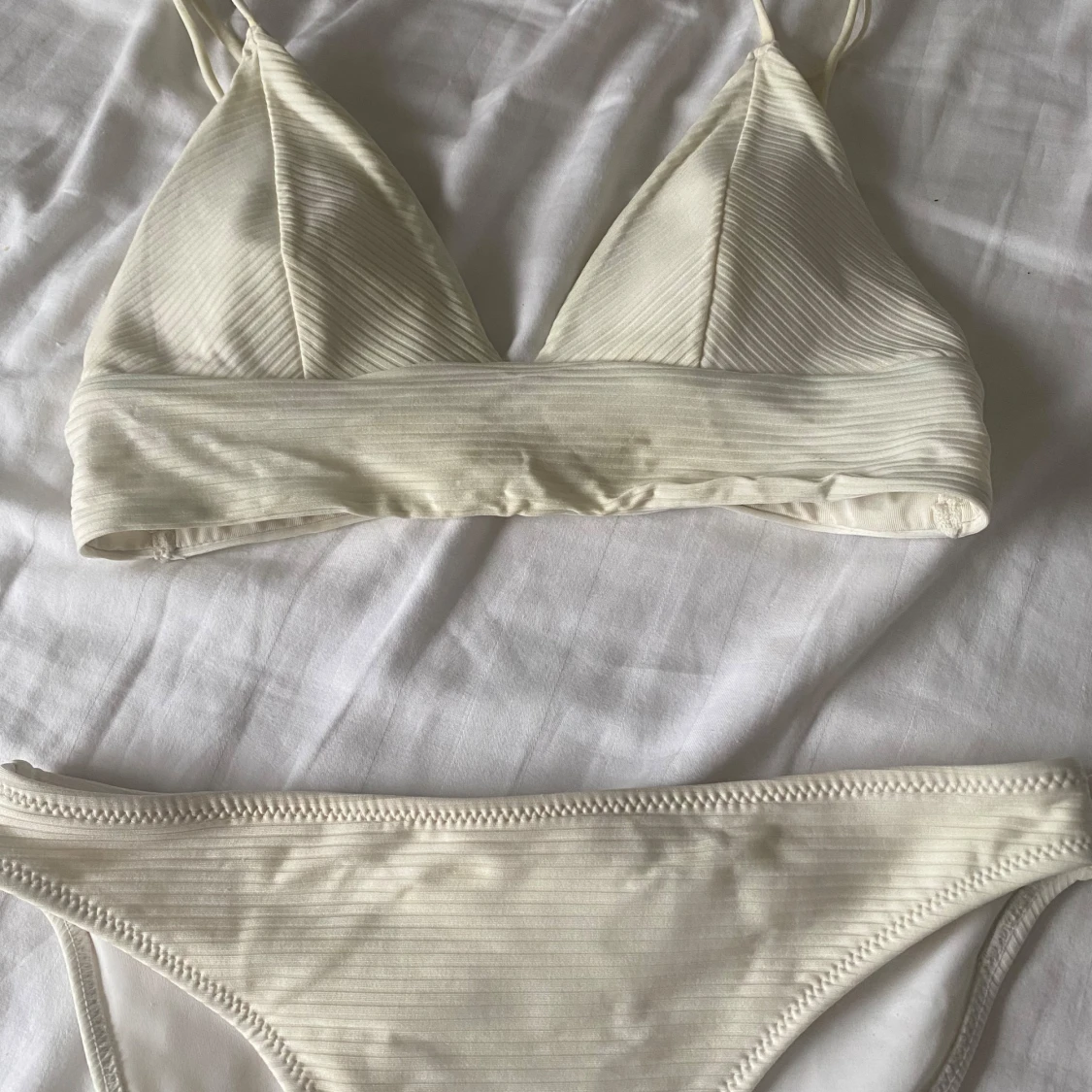 Snygg vit bikini med ribbad struktur. Överdelen har trekantskupor och smala axelband, medan underdelen är klassisk med låg midja. Perfekt för stranden eller poolen.