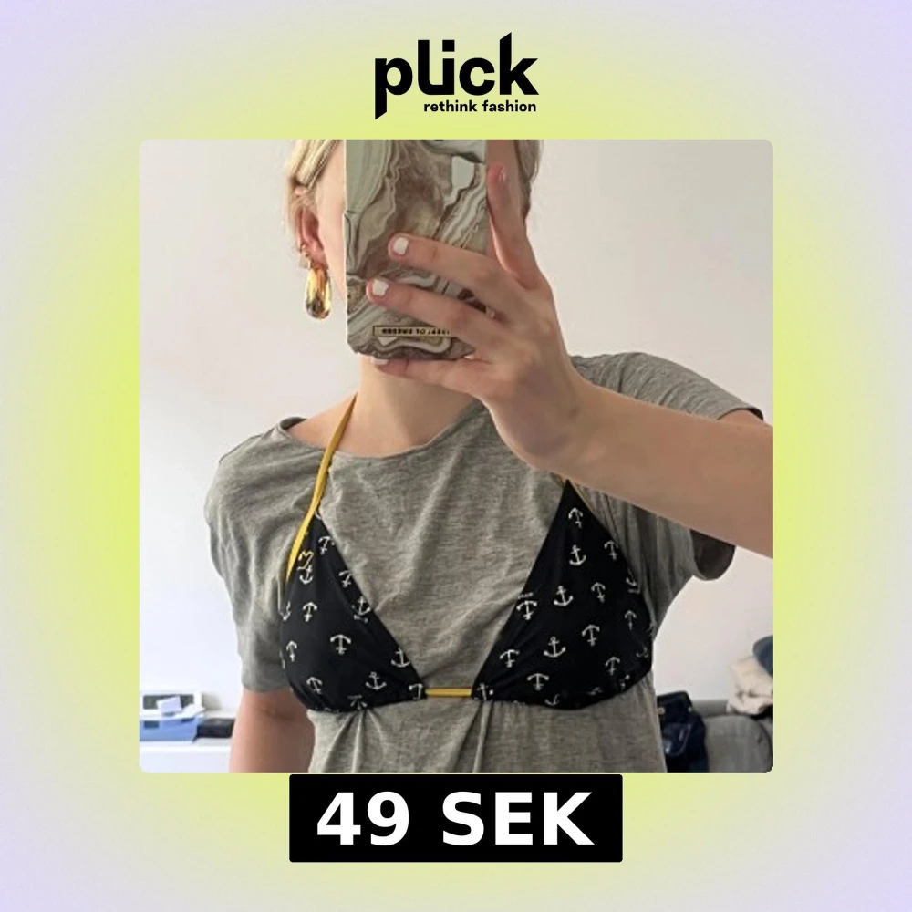 Säljer en svart trekantsbikini med vita ankare och gula knytband. Klassisk modell med knyt i nacken och ryggen. Perfekt för stranden eller poolen.