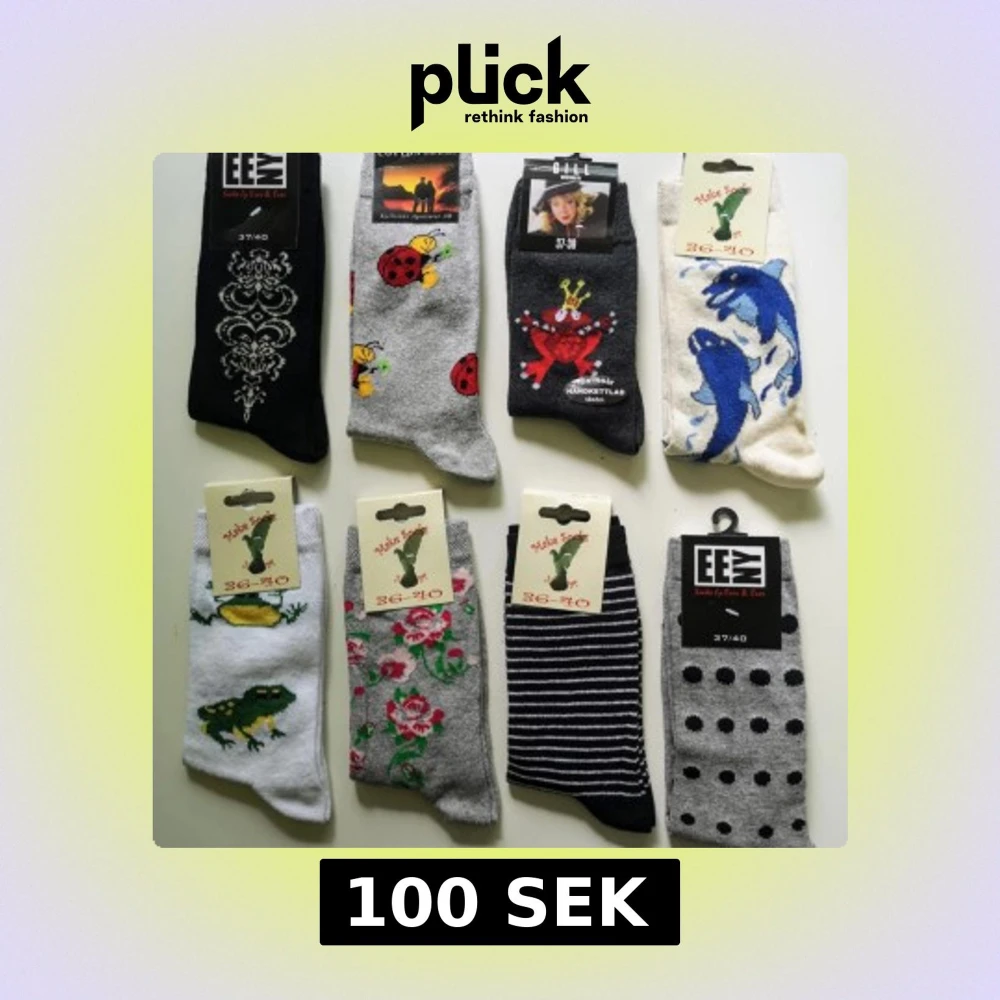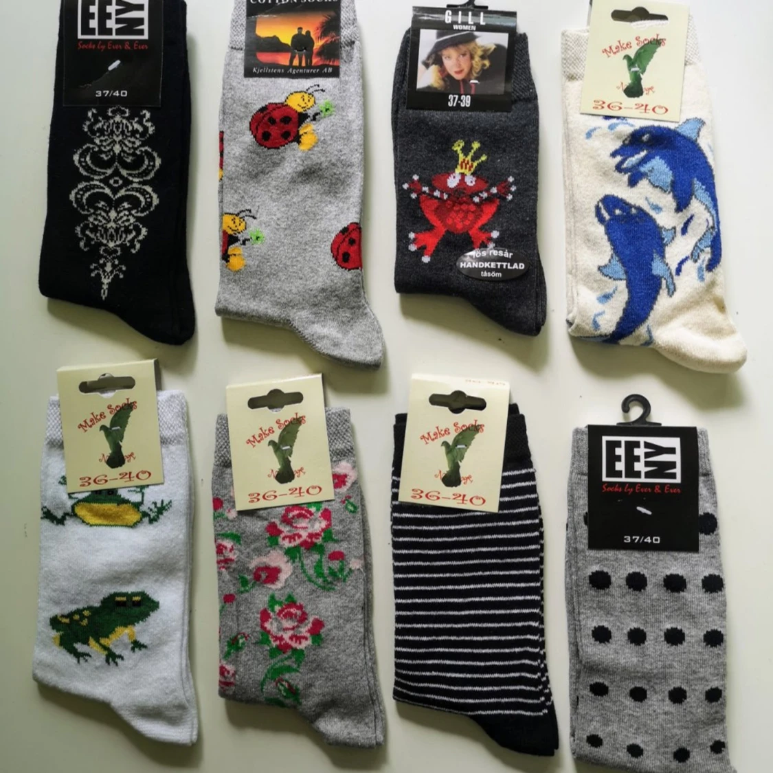 Ett set med åtta par strumpor i olika färger och mönster. Inkluderar motiv som nyckelpigor, grodor, blommor och ränder. Tillverkade av bomull, polyamid och elastan för komfort och hållbarhet. Perfekta för att liva upp vardagslooken!