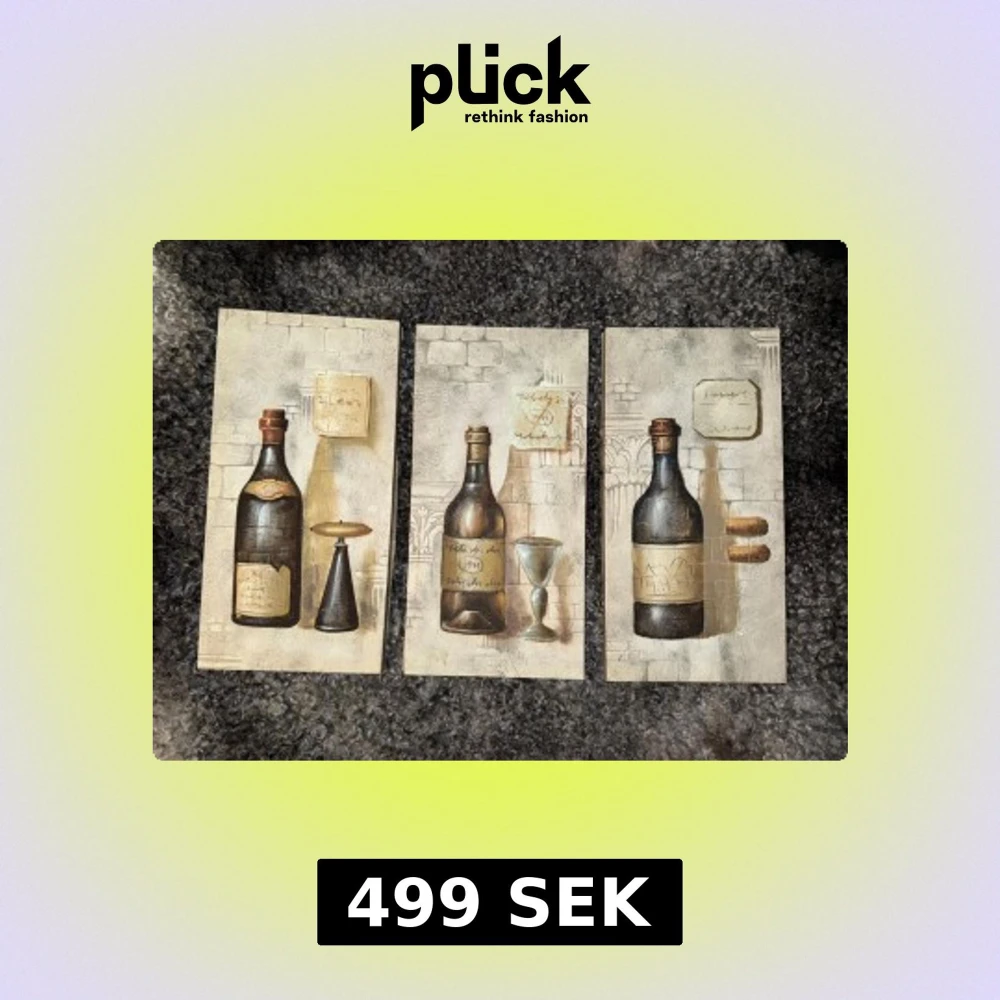 Bundle: 499 Separat: 199 Snyggt konsttryck i tre delar med motiv av vinflaskor, glas och korkar mot en bakgrund av stenvägg. Perfekt för dig som vill ge ditt rum en cool och vintage vibe! Passar både ungdomar och unga vuxna som gillar konst och inredning.