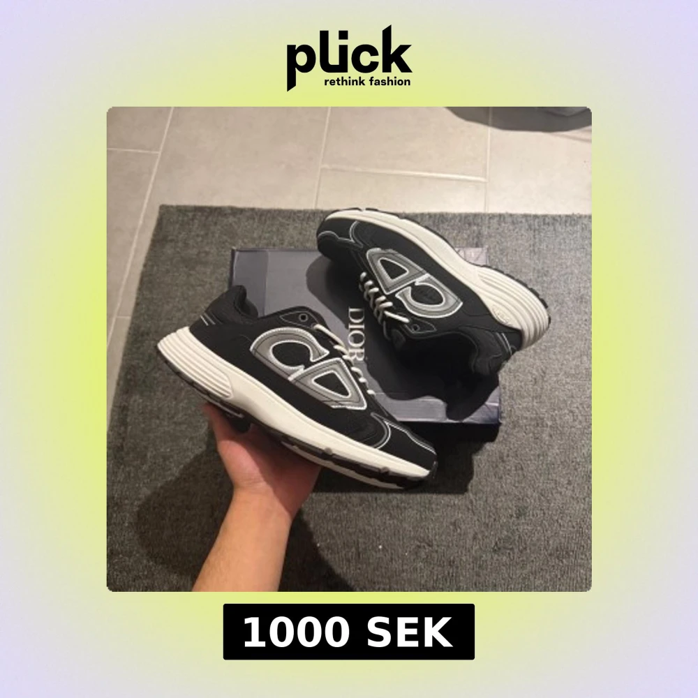 Säljer ett par Dior B30 sneakers i svart med vit och grå detaljer. Skorna har en chunky vit sula, mesh och syntetmaterial på ovandelen samt tydliga Dior-loggor på sidan och sulan. Klassisk snörning med vita skosnören och rund tå. Perfekt för dig som gillar exklusiva sneakers.