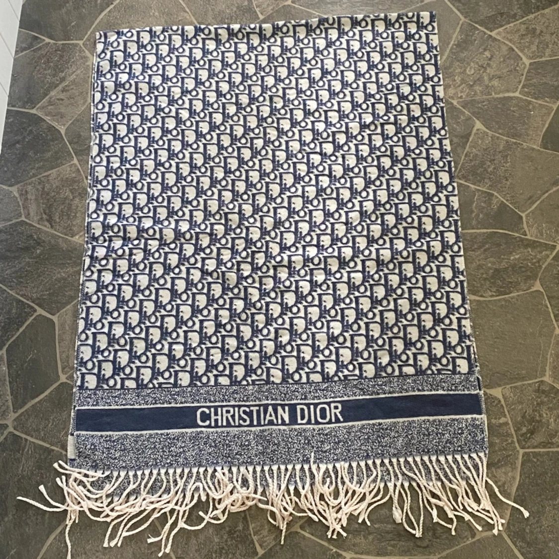 Snygg halsduk från Christian Dior i blått och vitt med klassiskt logomönster över hela tyget. Halsduken har fransar i ändarna och en bred kant med Christian Dior-tryck. Perfekt accessoar för att lyfta din outfit.