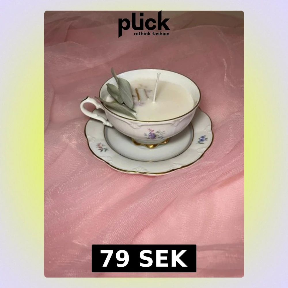 Det här ljuset är gjort av återanvändbara material. Tekoppen är köpt secondhand och stearinet är från kyrkor som tänkte slänga det. Det här ljuset har en svag doft utav vanilj, så känsliga även kan använda det. Det här ljuset är även dekorerat med torkade blad och kanel