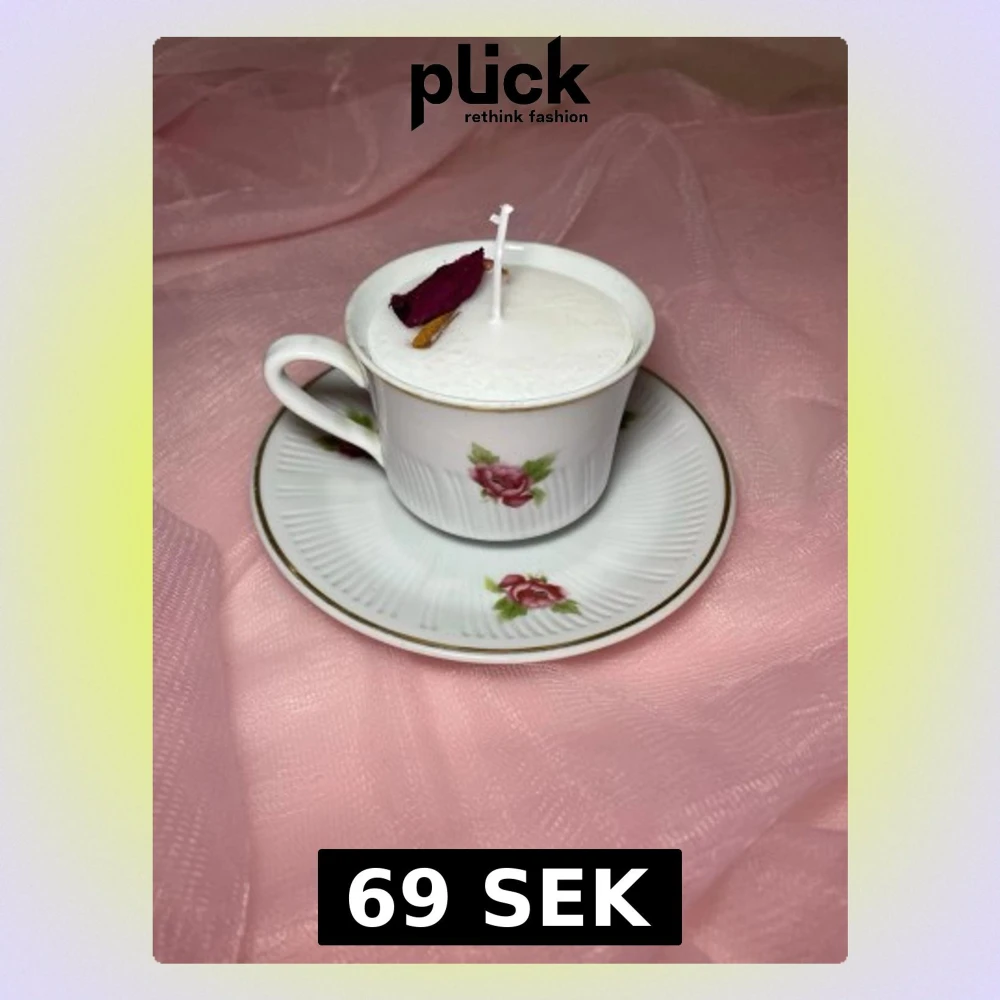 Det här ljuset är gjort av återanvändbara material. Tekoppen är köpt secondhand och stearinet är från kyrkor som tänkte slänga det. Det här ljuset har en svag doft utav vanilj, så känsliga även kan använda det. Det finns även fler ljus med denna design på hemsidan, om man vill köpa sets. Det här ljuset har även torkade blommor på och kanel