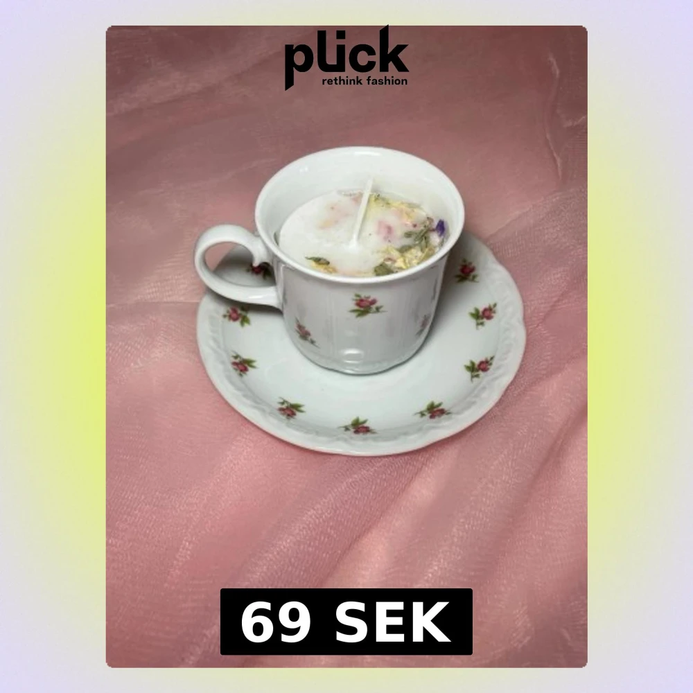 Det här ljuset är gjort av återanvändbara material. Tekoppen är köpt secondhand och stearinet är från kyrkor som tänkte slänga det. Det här ljuset har en svag doft utav vanilj, så känsliga även kan använda det. Det här ljuset är även dekorerat med torkade blommor på och det finns fler utav samma design på hemsidan ifall att man vill ha sets.