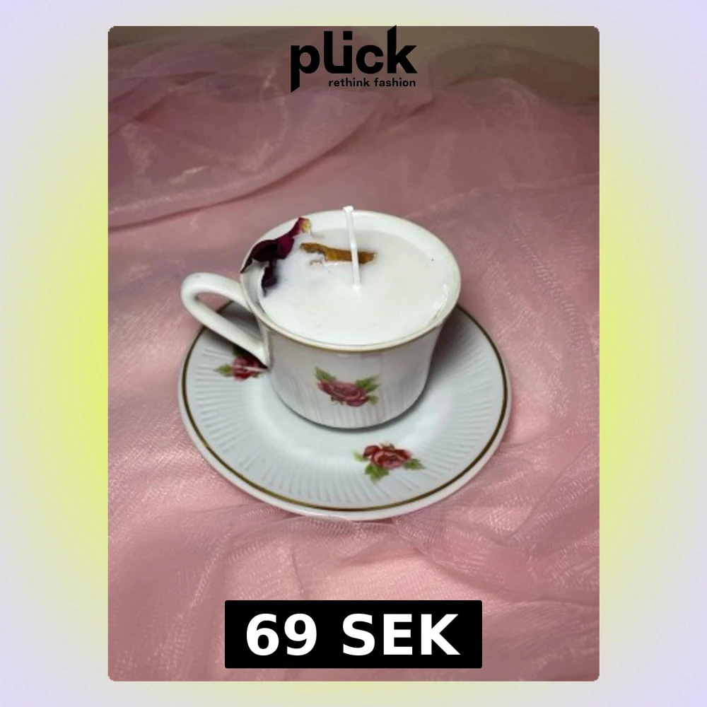 Det här ljuset är gjort av återanvändbara material. Tekoppen är köpt secondhand och stearinet är från kyrkor som tänkte slänga det. Det här ljuset har en svag doft utav vanilj, så känsliga även kan använda det. Det finns även fler ljus med denna design på hemsidan, om man vill köpa sets. Det här ljuset har även torkade blommor på och kanel