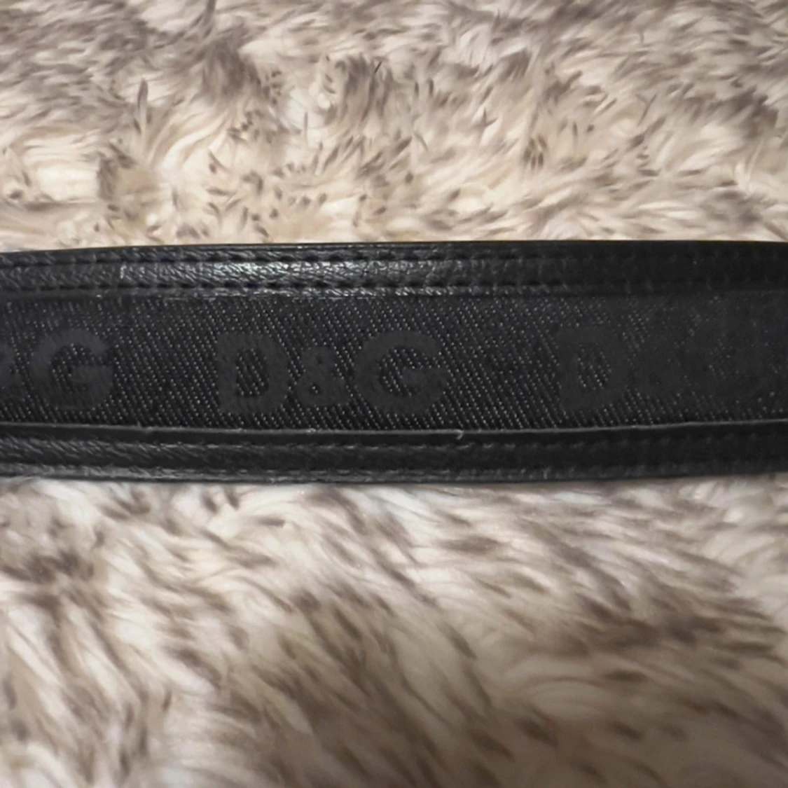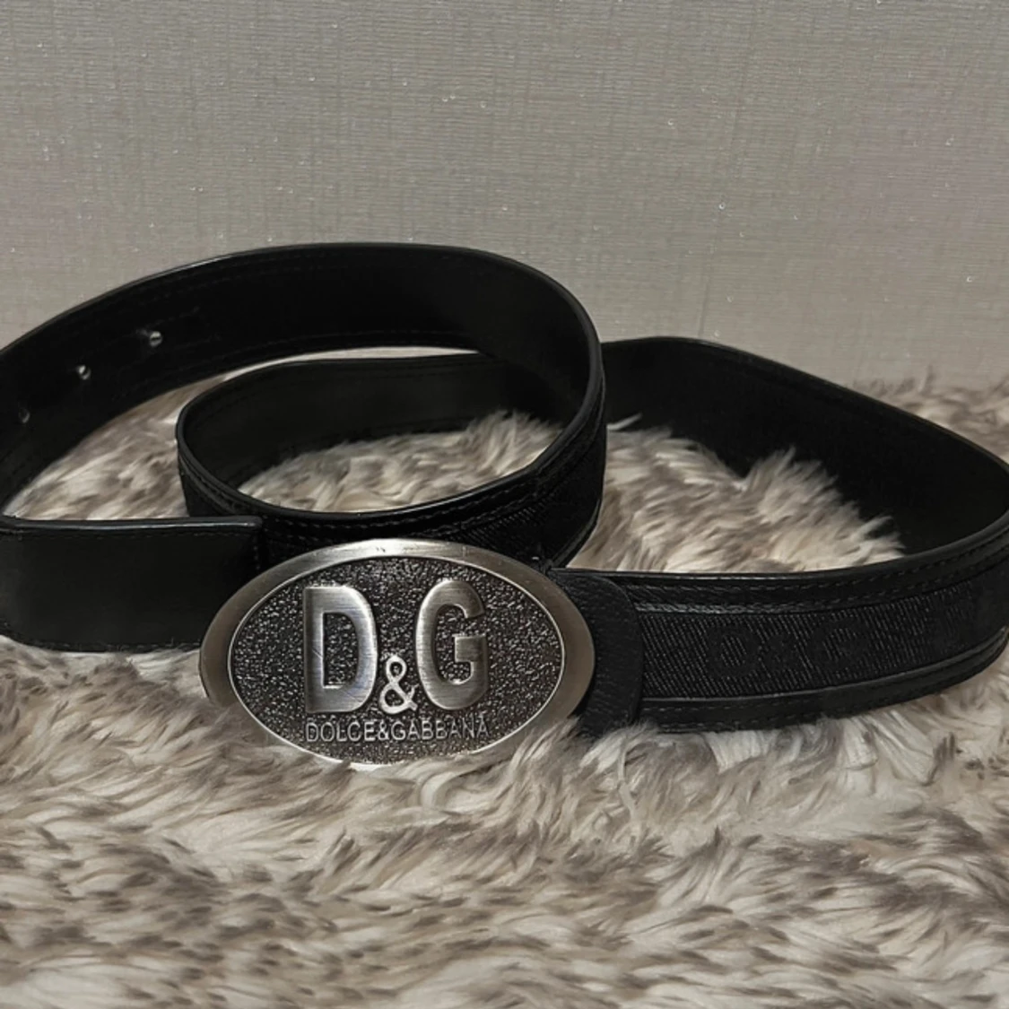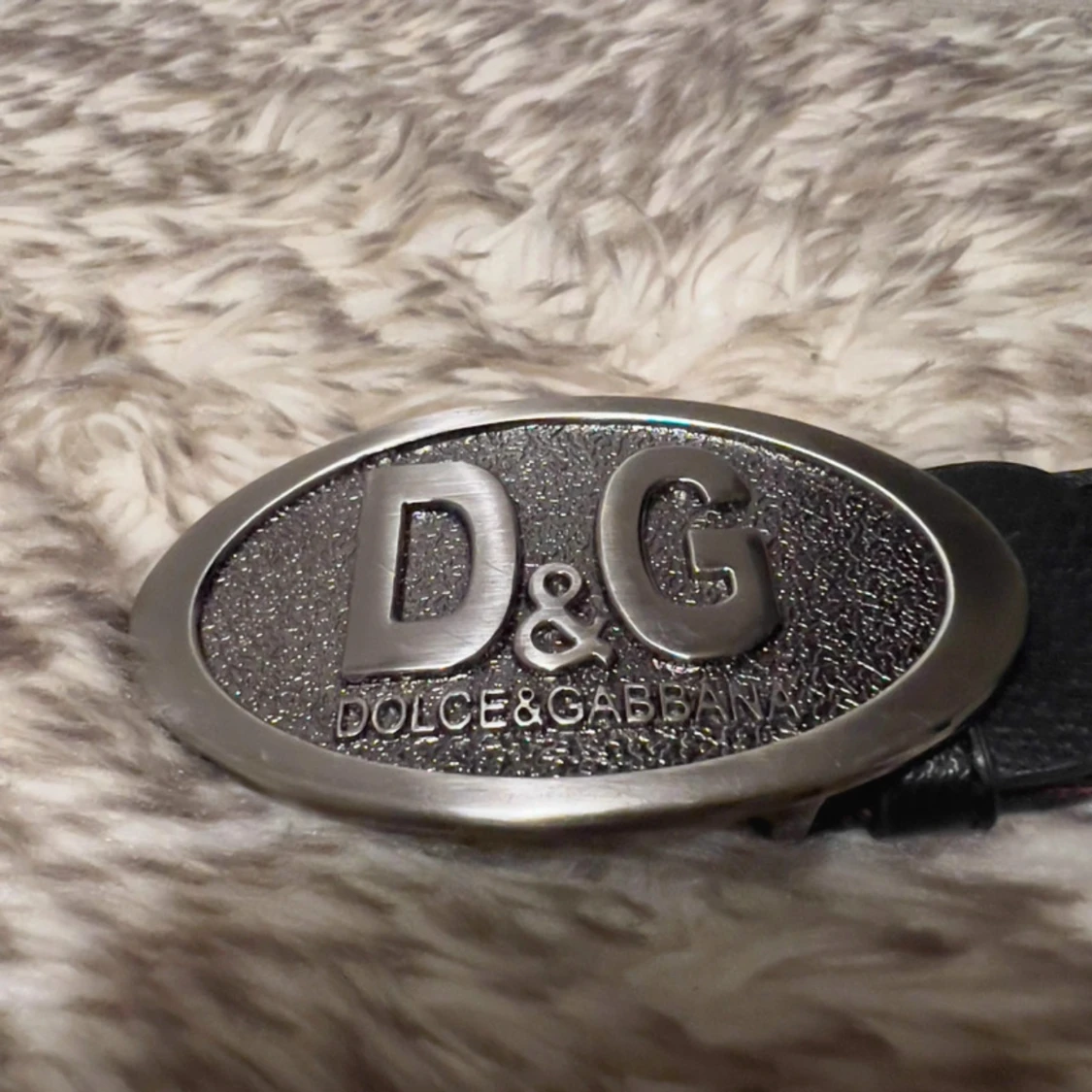Säljer ett svart Dolce & Gabbana skärp med en stort oval silverspänne där D&G-loggan står ut. Bältet är gjort i skinn och har D&G-tryck längs hela bandet. Bälteshålen är lite slitna. 100 cm.
