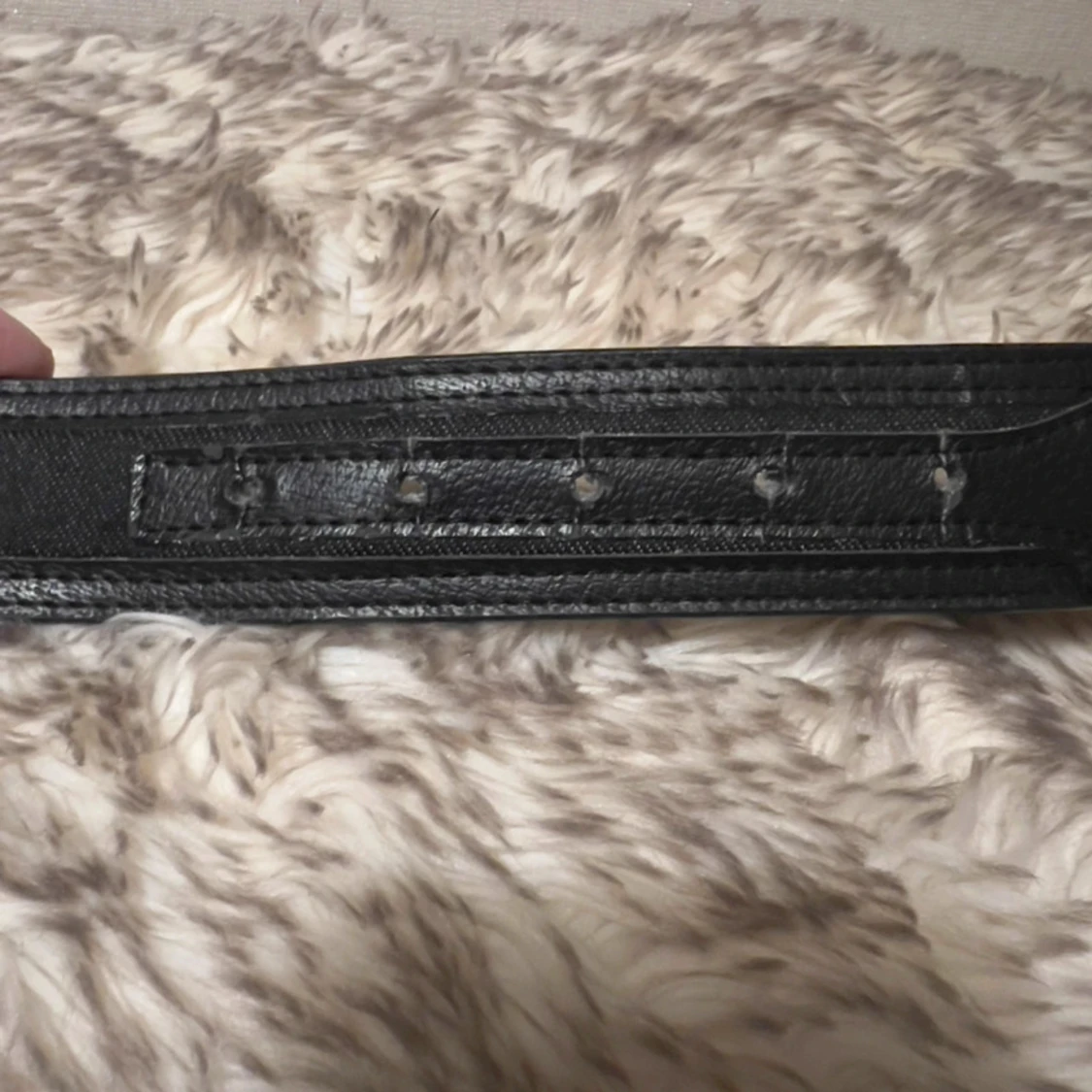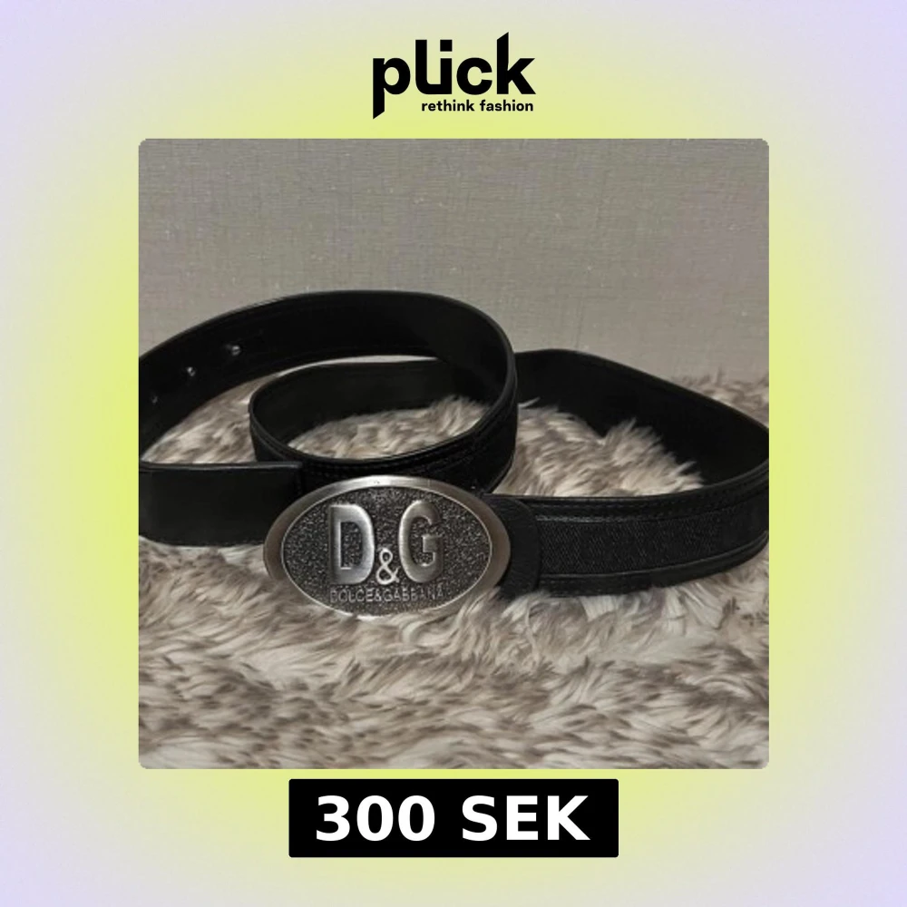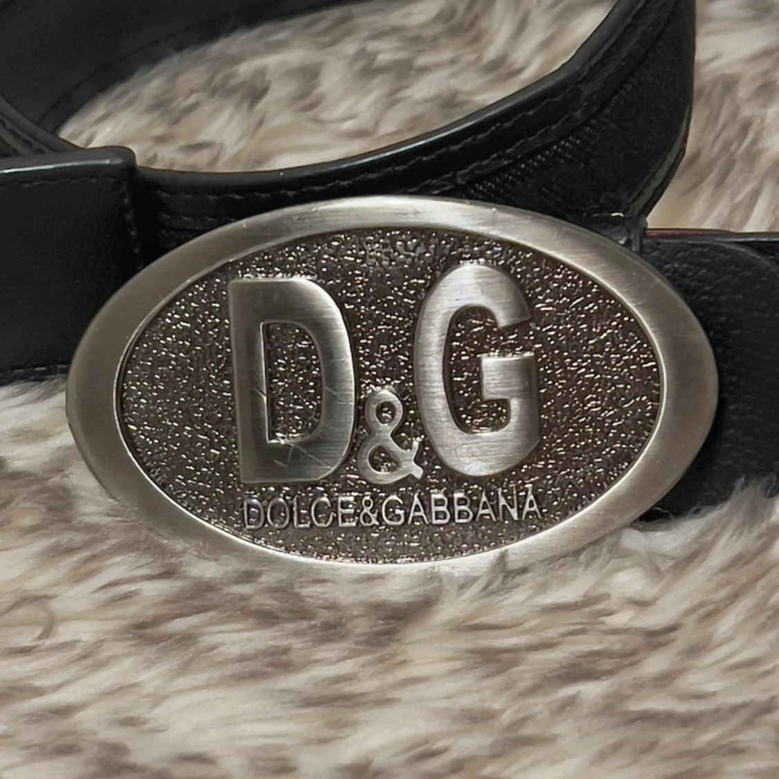Säljer ett svart Dolce & Gabbana skärp med en stort oval silverspänne där D&G-loggan står ut. Bältet är gjort i skinn och har D&G-tryck längs hela bandet. Bälteshålen är lite slitna. 100 cm.