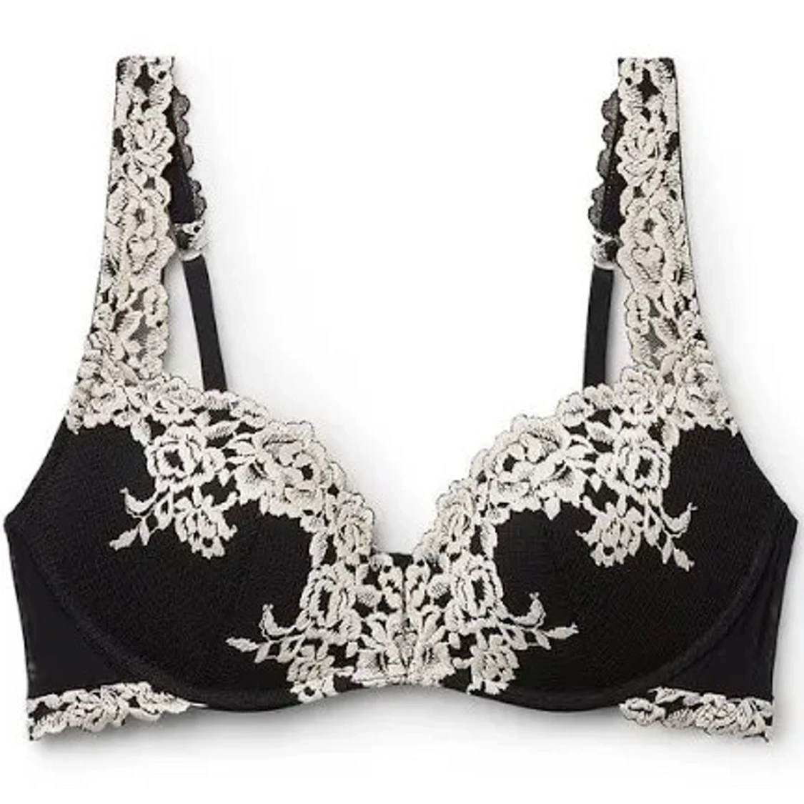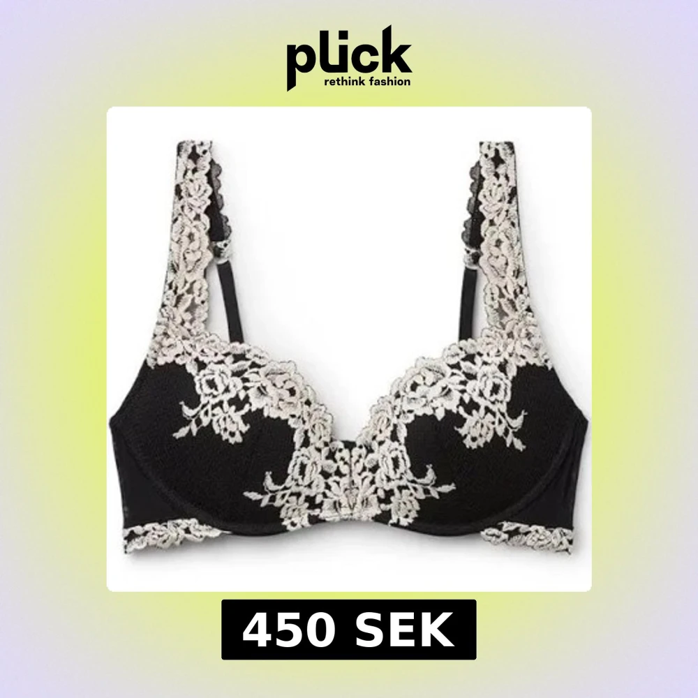Elegant svart behå med vacker vit spets och blommönster. Den har justerbara axelband och en bekväm passform. Perfekt för att känna sig extra fin. Helt oanvänd