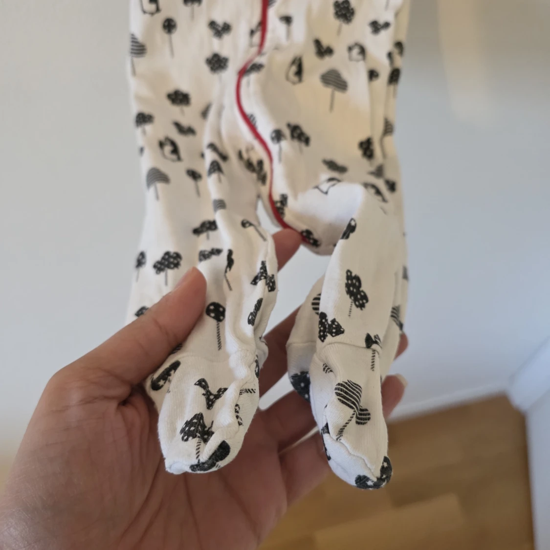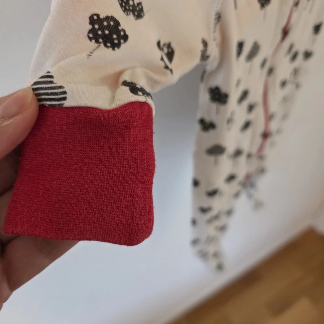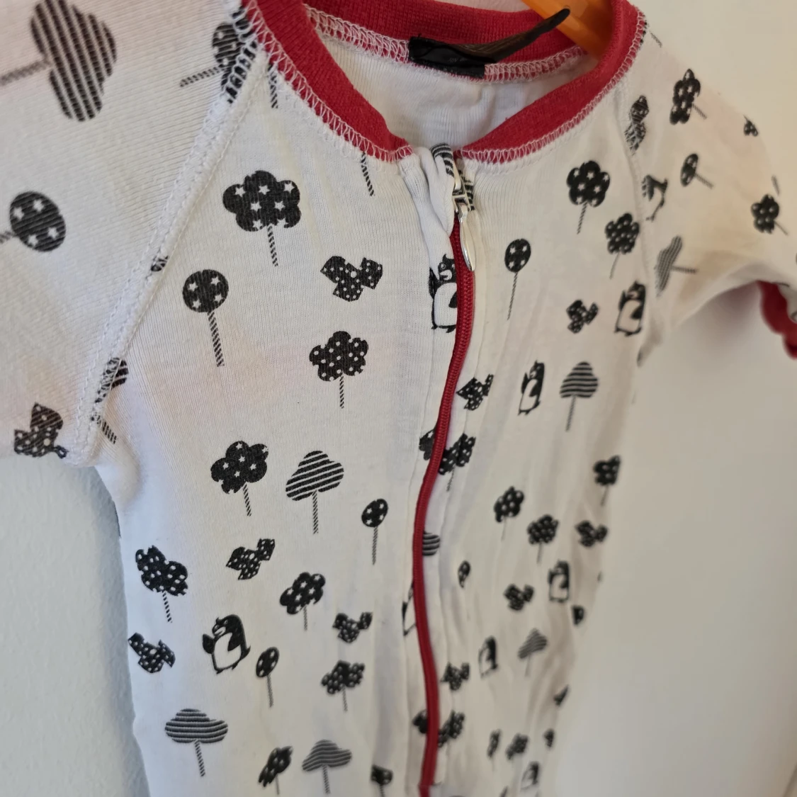 Söt vit pyjamas med svarta mönster av träd och djur, röda muddar och krage. Dragkedja framtill för enkel påklädning. Mjukt bomullsmaterial och hel täckning för både armar och ben, perfekt för chill dagar hemma.