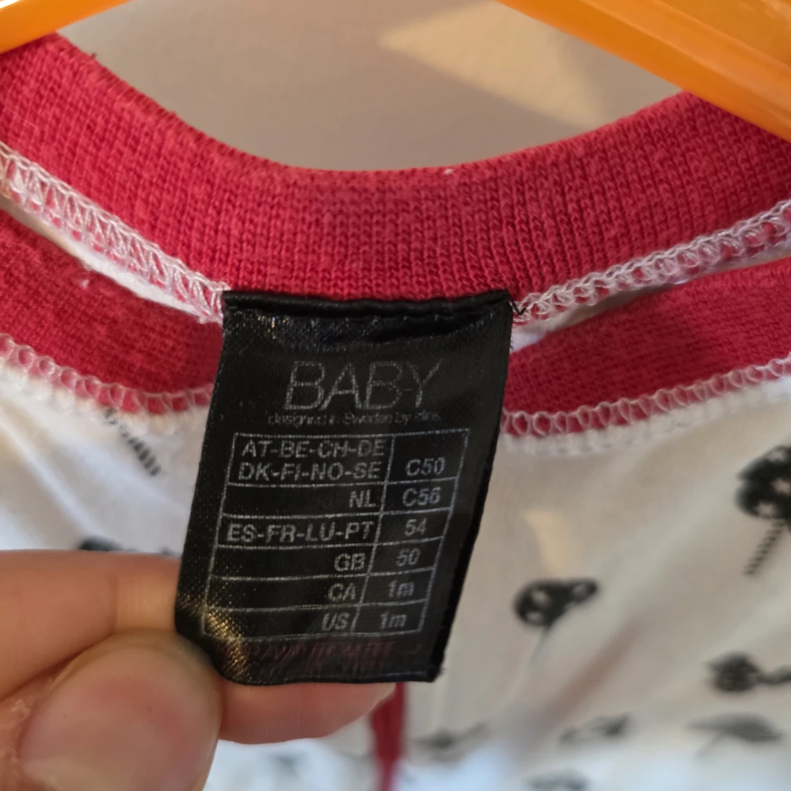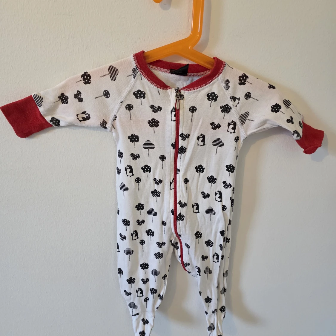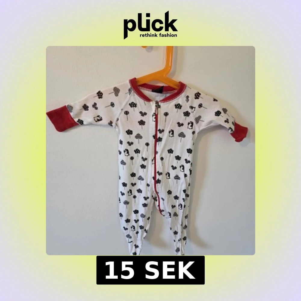 Söt vit pyjamas med svarta mönster av träd och djur, röda muddar och krage. Dragkedja framtill för enkel påklädning. Mjukt bomullsmaterial och hel täckning för både armar och ben, perfekt för chill dagar hemma.