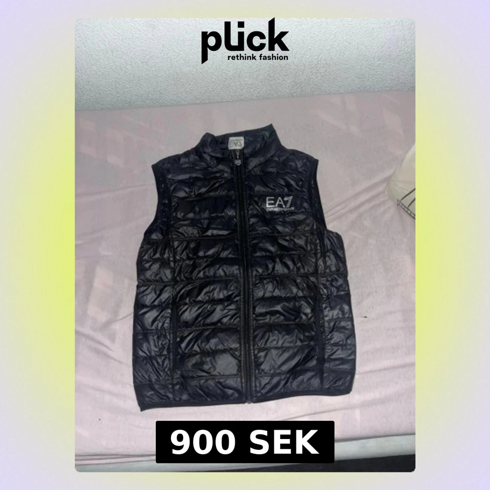 Snygg svart dunväst från EA7 Emporio Armani med quiltad design och hög krage. Västen har en tydlig logga på bröstet och dragkedja framtill. Perfekt att slänga över en hoodie för en cool streetstyle-look. Materialet är glansigt och känns lätt men ändå värmande. En jätte liten håll vid fickan typ fast den syns knappt tog mig ett tag tills jag hitta den (priset kan diskuteras) storlek S, en ny sån här väst kan ligga på värde mellan 1300-1800kr