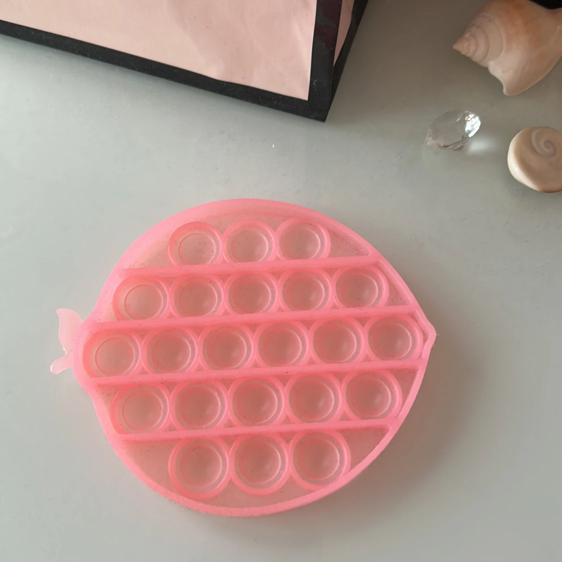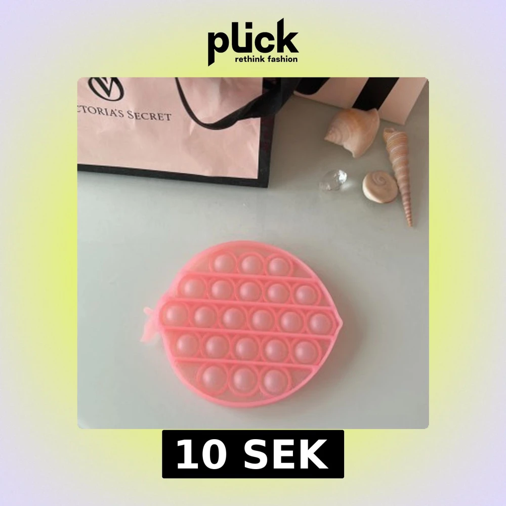 Bilderna visar en rosa pop it-leksak i silikon, formad som en rund frukt med bubblor att trycka på. Produkten är i gott skick utan synligt slitage eller defekter. Perfekt som stressleksak eller sensorisk fidget. Ingen elektronik eller tekniska funktioner.