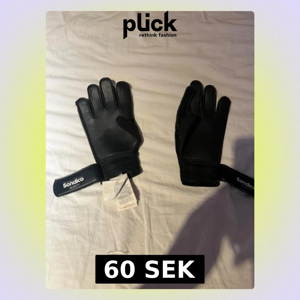 Två par svarta målvaktshandskar från Sondico. Ena paret är helsvart med breda kardborreband och Sondico-logga, det andra paret har svart bas med gula detaljer och Sondico S på ovansidan. Båda paren har förstärkta fingrar och greppvänlig insida. Prövat dom en gång men dom var för små för mig