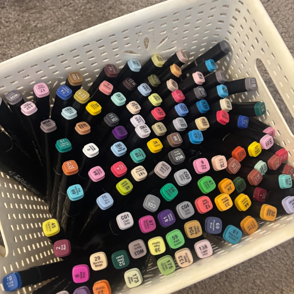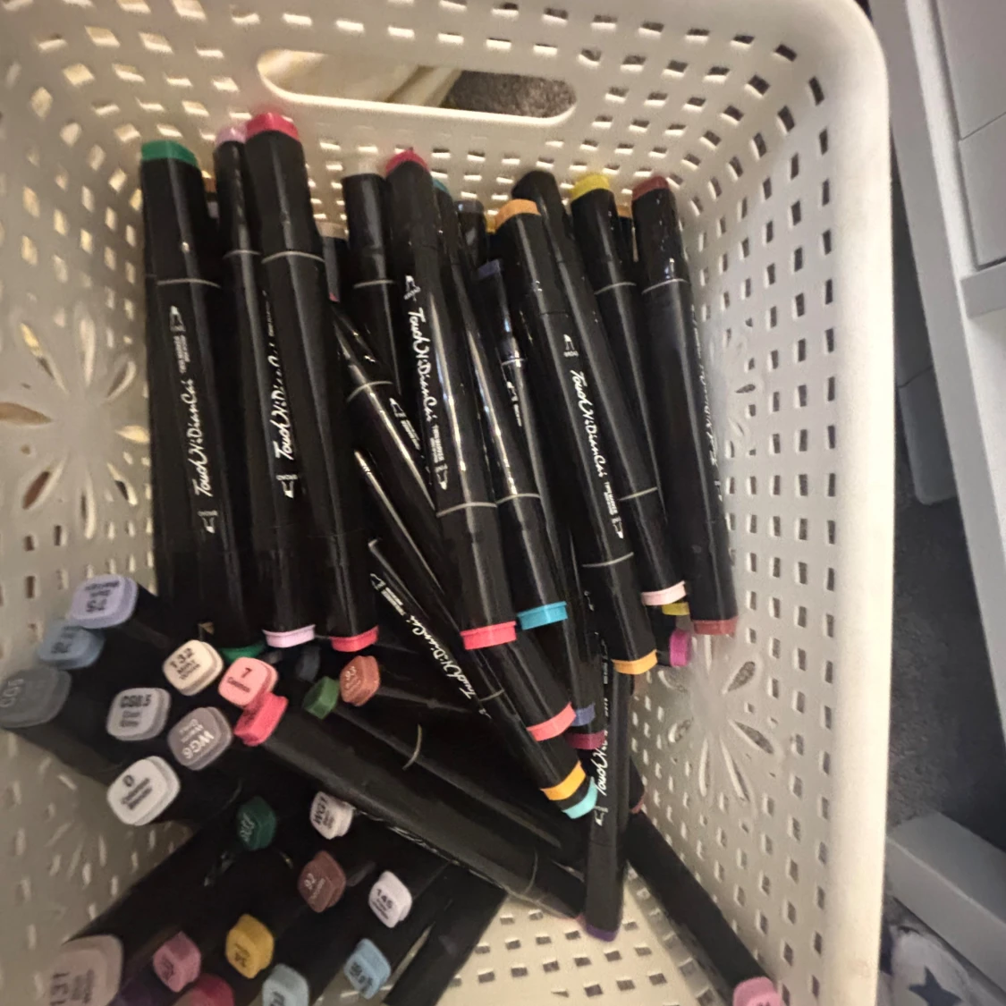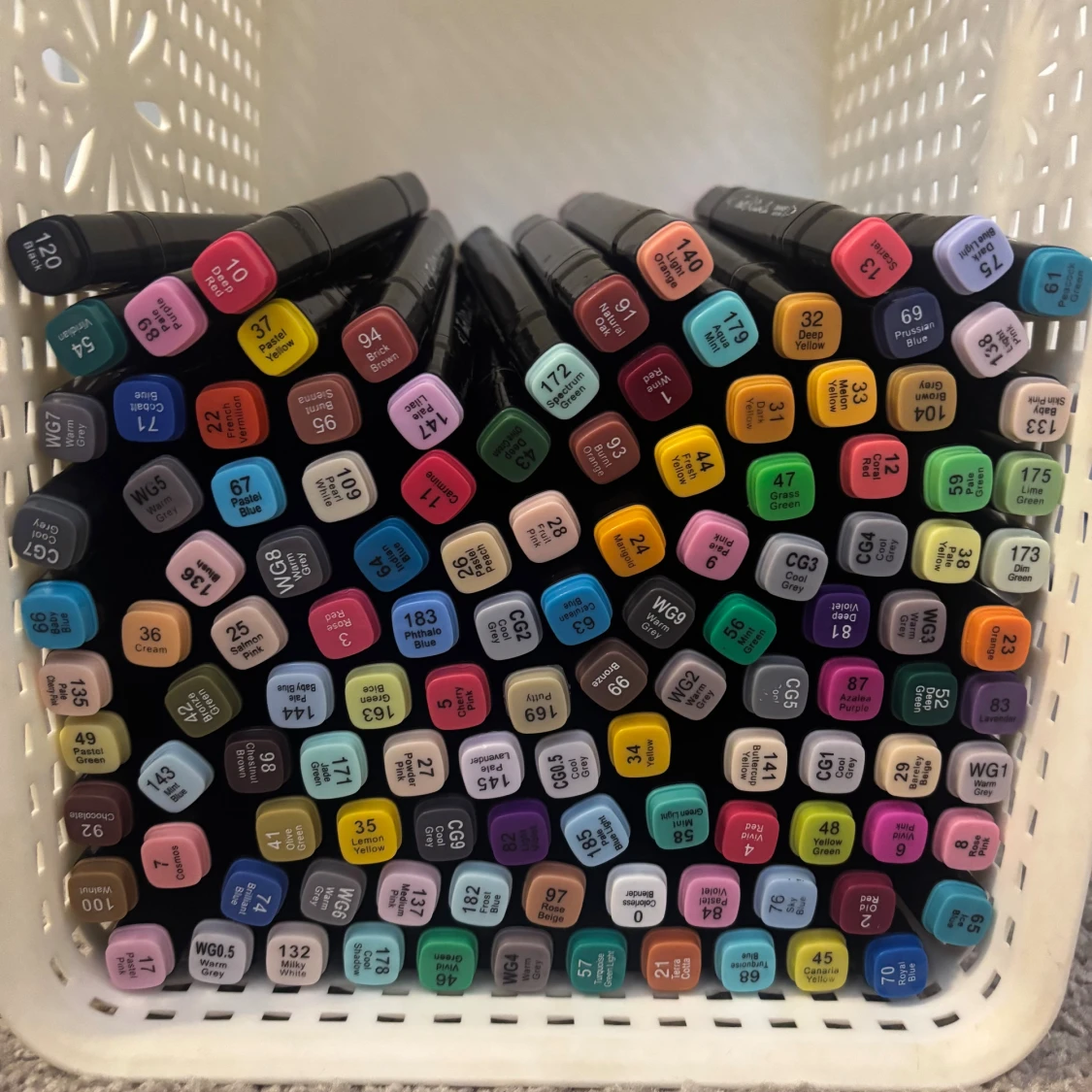 Finns runt 250st pennor, köptes för 799kr, skulle säga att kanske runt 10 pennor är uttårkad. Men det finns ett medel att köpa på Biltema för att pennorna som blivit uttårkad ska få tillbaka färgen.