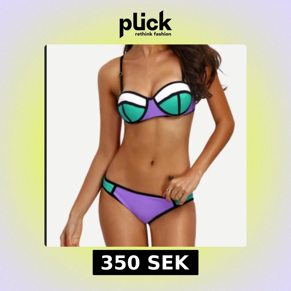Snygg bikini med bygel och push-up kupor. Överdelen har justerbara axelband och knäppning bak. Underdelen har matchande färgblock och sitter bekvämt på höften. Aldrig använd. Storlek M men passar Xs-S också!☺️💗