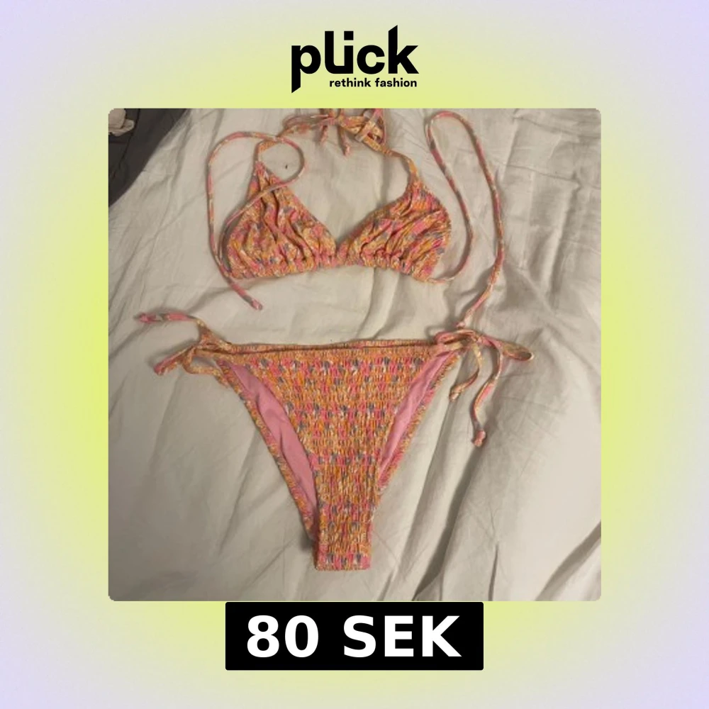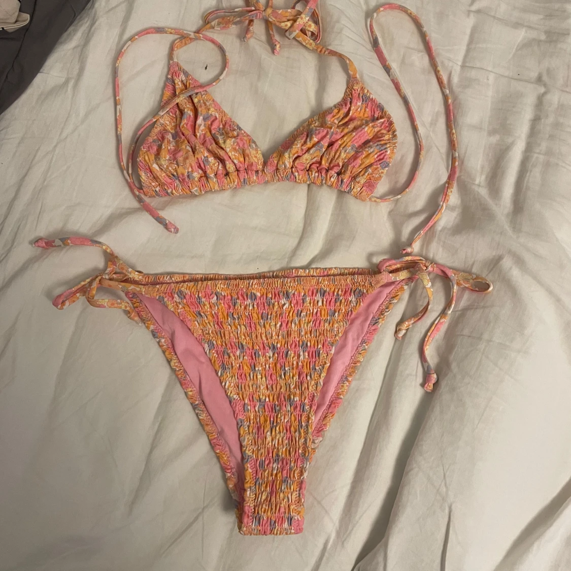 Superfin bikini i rosa, orange och gul med smockat tyg och knyt i sidorna och nacken. Triangeltopp och klassiska bikinitrosor med justerbara band. Perfekt för stranden eller poolen!
