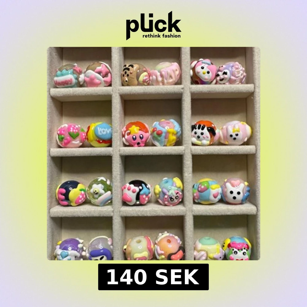 Unika och färgglada pärlor med olika söta figurer i pastellfärger. 36 st säljes annars för 6 kr st. Bla kirby, kuromi. Hello Kitty. Perfekt för dig som vill sticka ut med roliga accessoarer! 16 mm