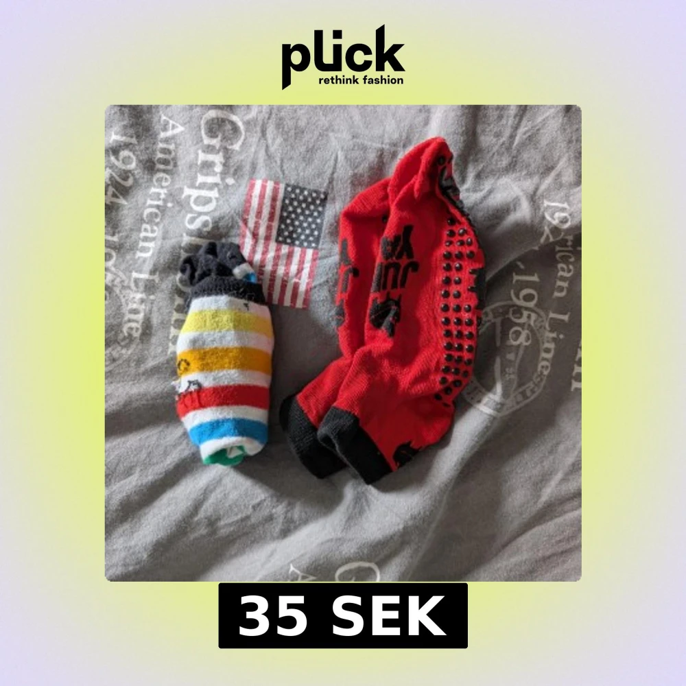 Två par coola strumpor, Yamp yard i storlek M men det andra paret är barn storlek, står inte. Ena paret är randiga i svart, vit, gul, orange, röd och blå med siluettmotiv. Det andra paret är röda med svarta detaljer och halkskydd under foten. Perfekta för att chilla hemma eller springa runt inomhus.