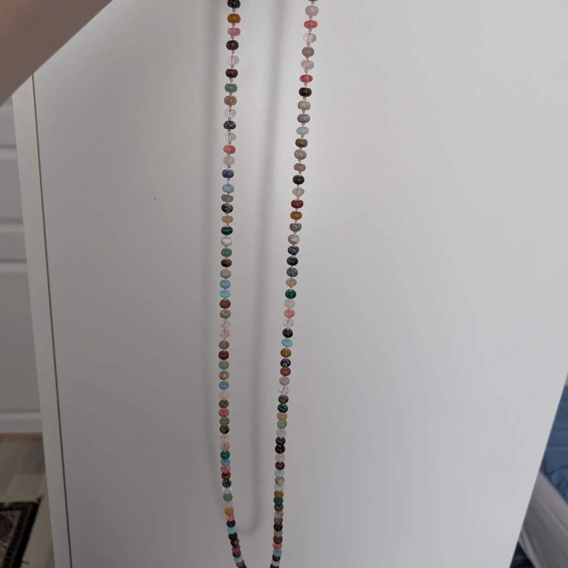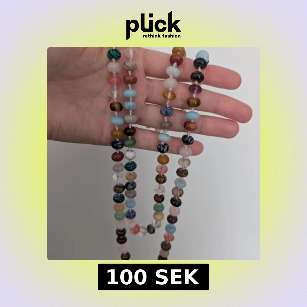 Långt halsband med massor av färgglada pärlor i olika former och nyanser. Pärlorna är runda och platta, och kommer i färger som blå, grön, rosa, brun, svart, vit och gul. Perfekt för dig som vill ha en unik och lekfull accessoar som sticker ut.