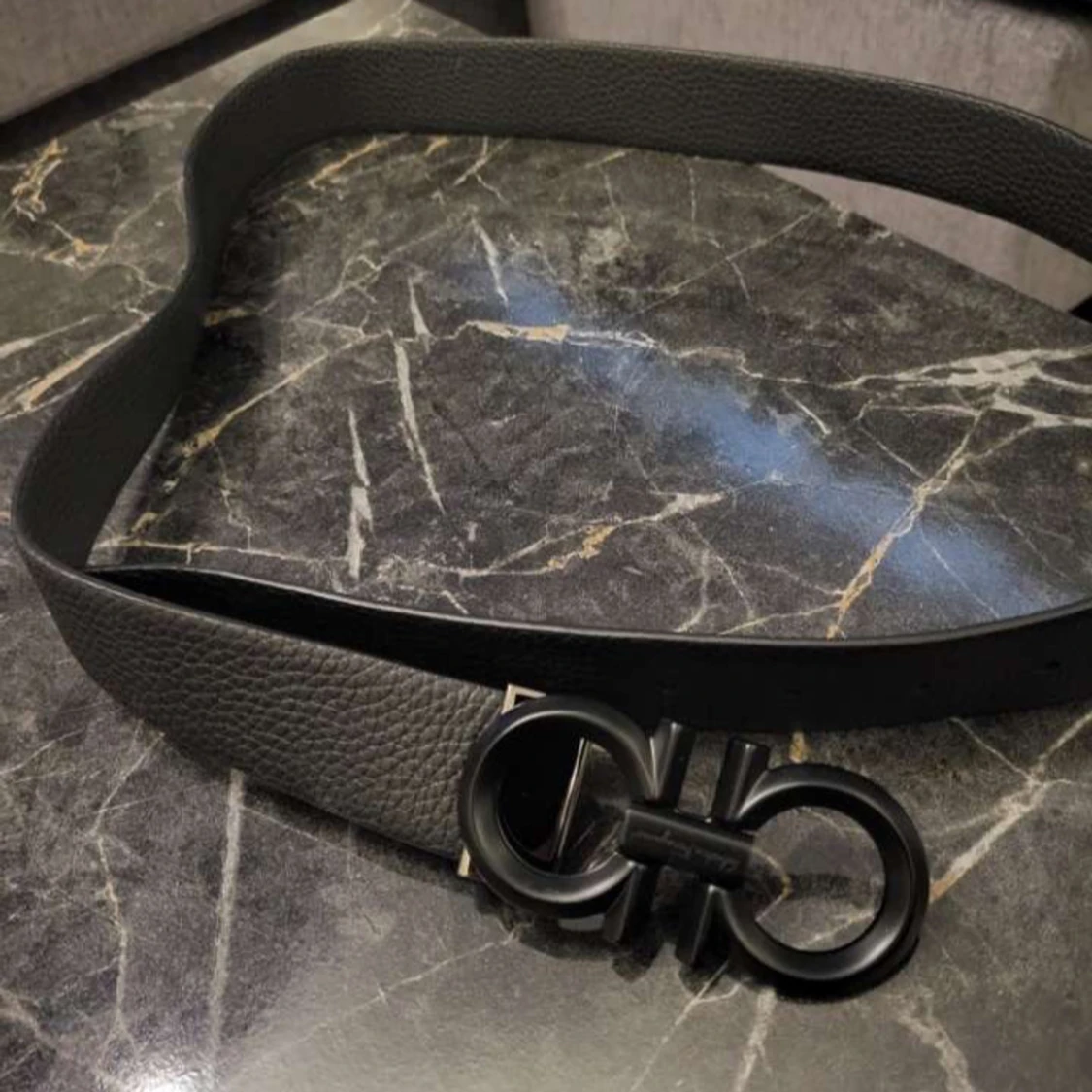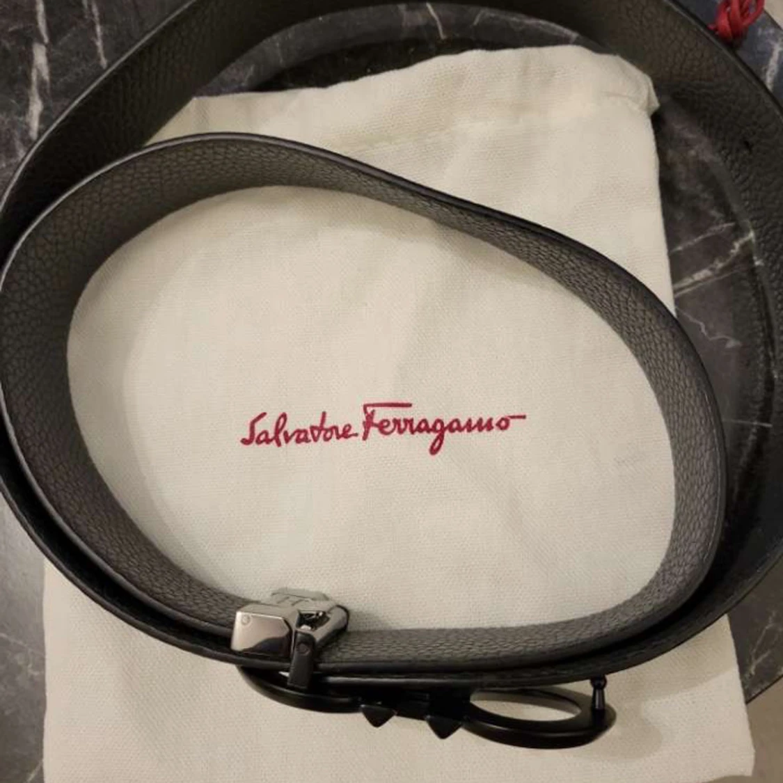 Stilrent svart bälte från Salvatore Ferragamo i äkta skinn med en ikonisk dubbelringad metallspänne i matt svart finish. Bältet har en klassisk, slät design med lätt texturerad yta och justerbara hål. Perfekt accessoar för att lyfta din outfit. Knappt använt, (köpt i usa för 5900). Pris kan diskuteras!